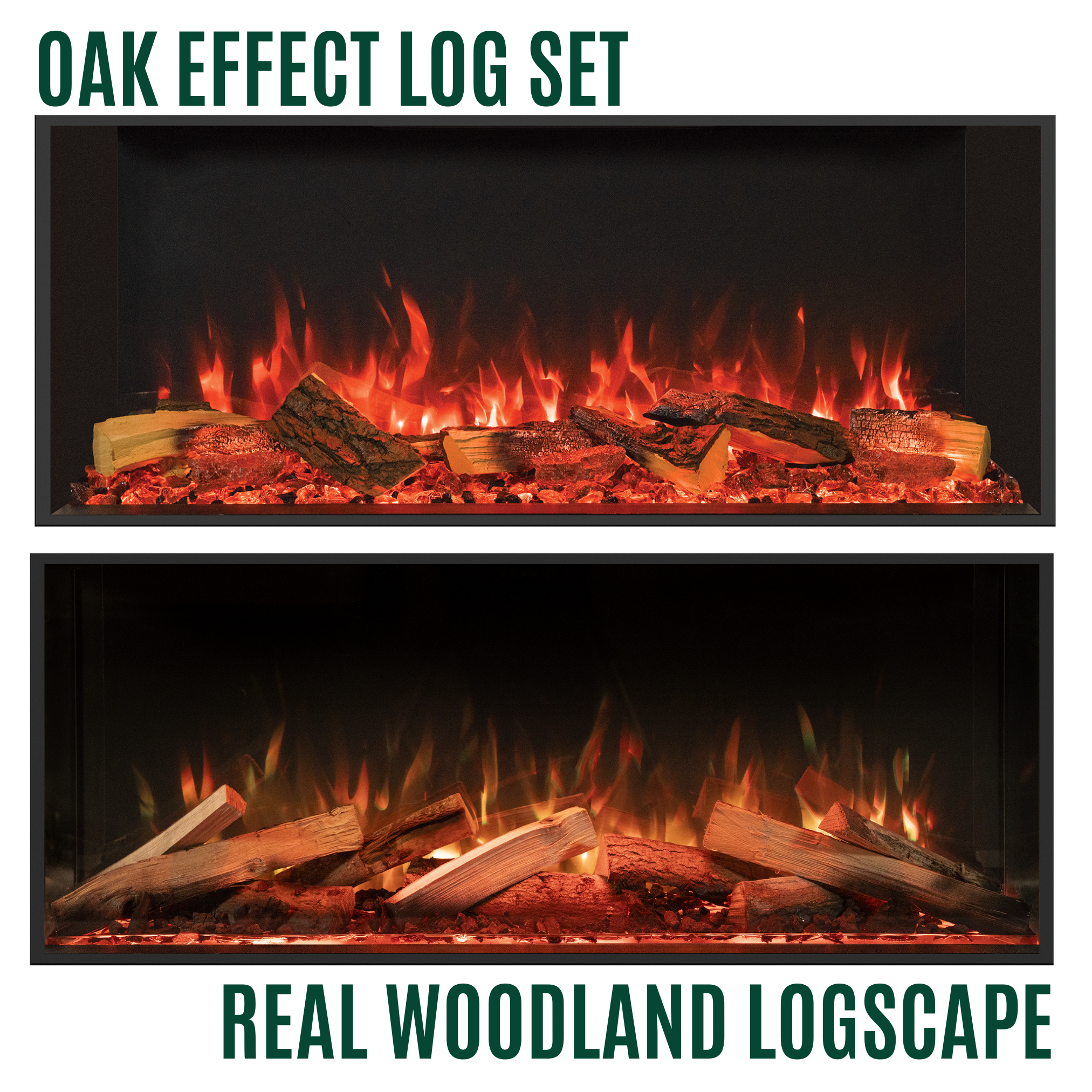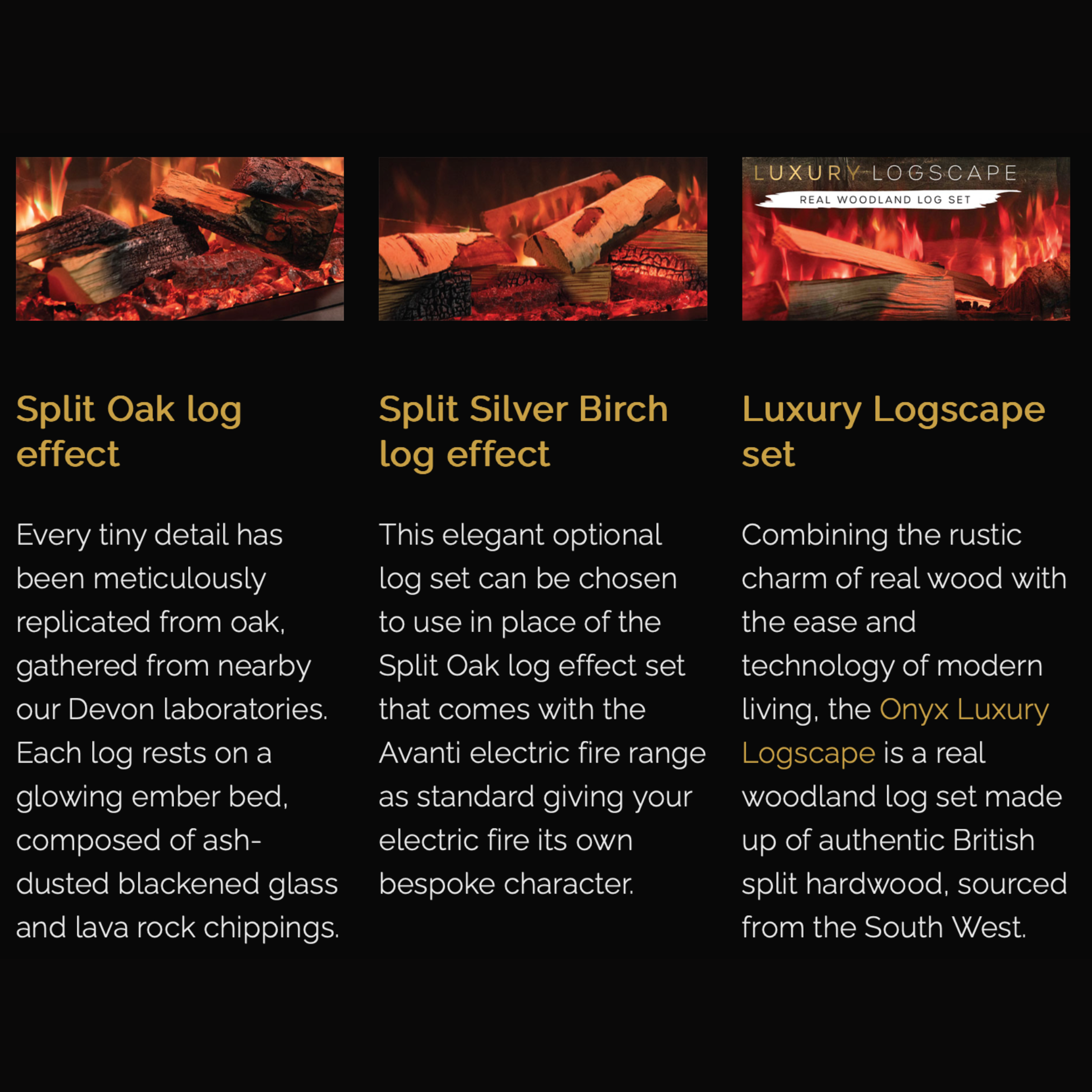 Discover the Onyx Avanti electric fire range, now featuring the Luxury Logscape Real Woodland Log Set - authentic British split hardwood, hand-finished for ultimate realism.