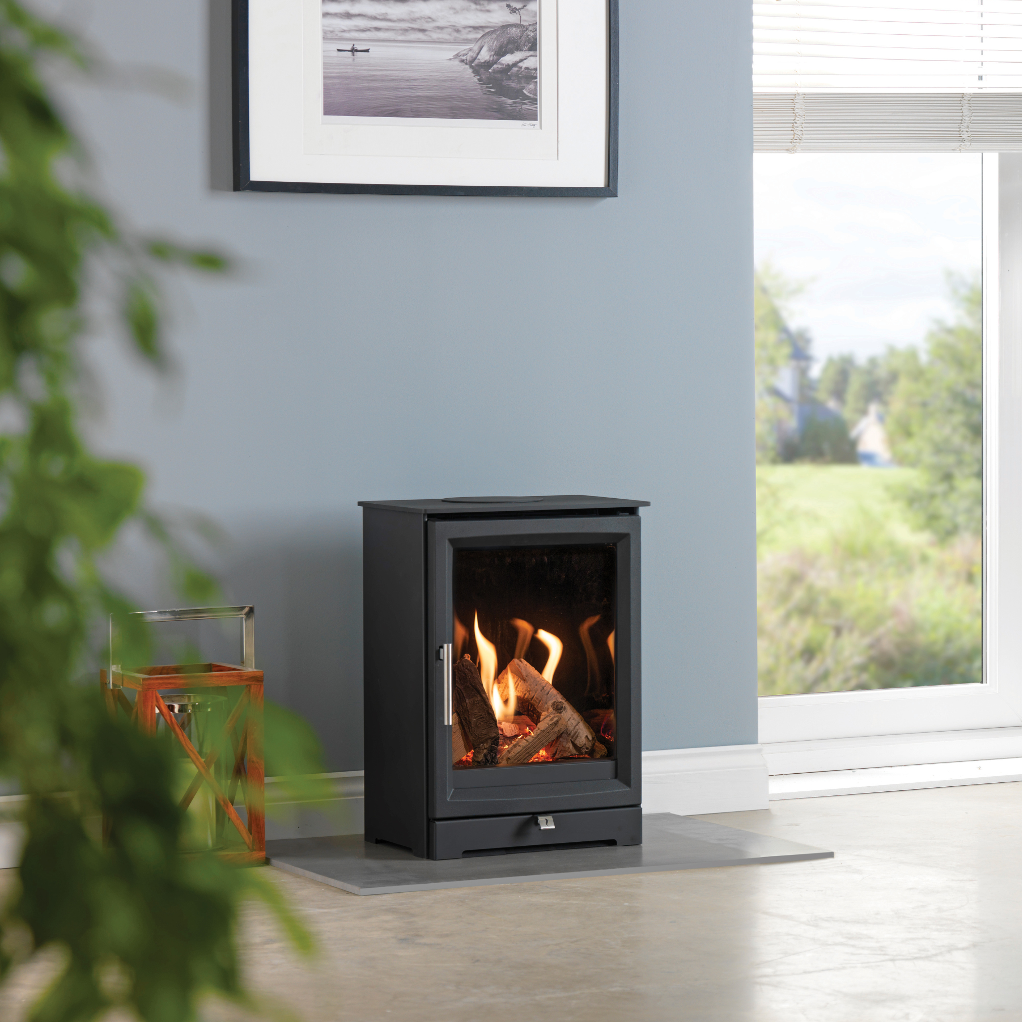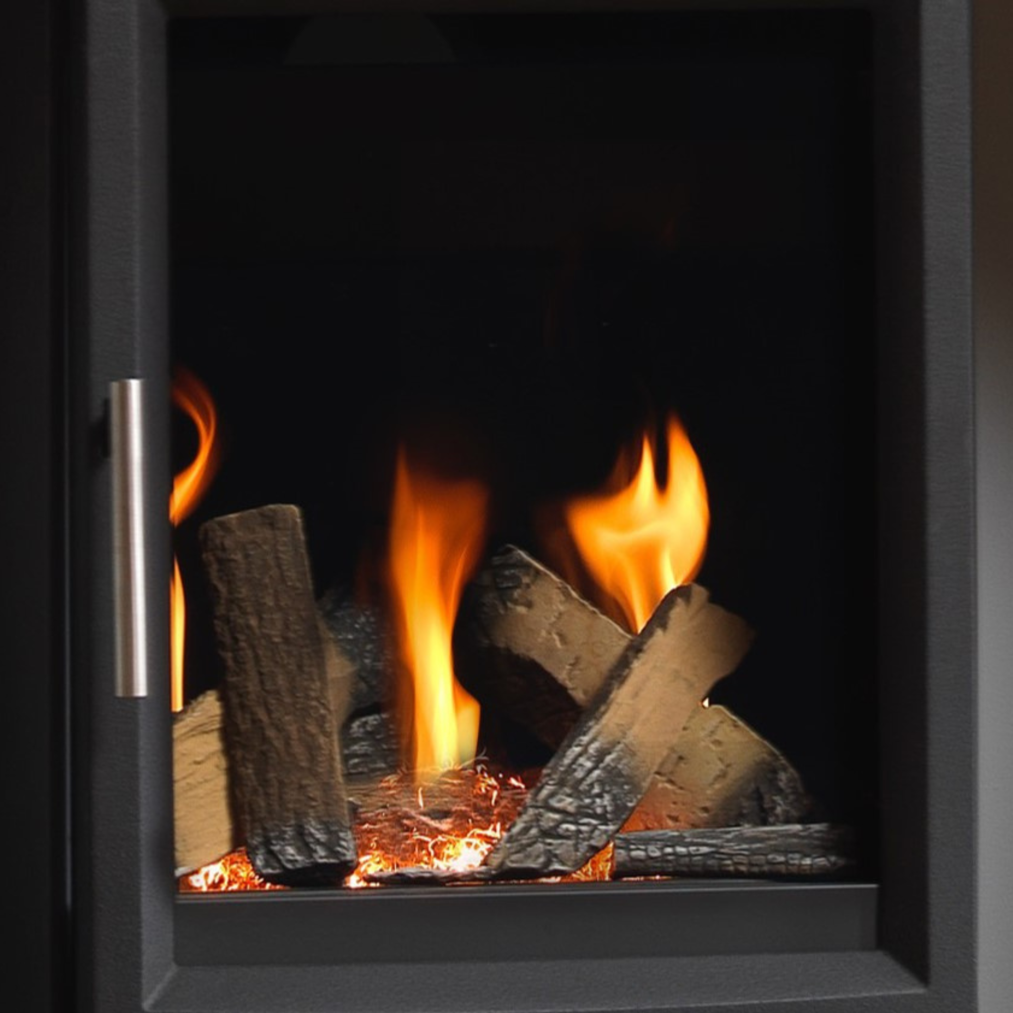 This stylish balanced flue gas stove offers a large panoramic glass window, showcasing the mixed log effect fuel bed and the nest of embers within.