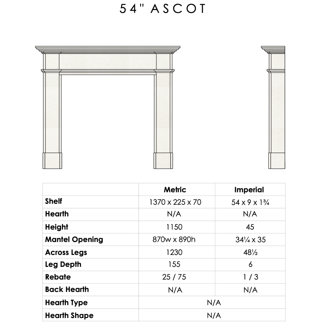 The Ascot Mantel is a refined blend of classic design and contemporary elegance. Available in 54" or 57" widths and with a 1" or 3" rebate, this mantel offers flexibility to suit a variety of fireplace settings. Crafted from beautiful Aegean Limestone, the Ascot showcases a clean, architectural form complemented by a subtly decorative shelf—creating a statement piece that bridges traditional and modern interior styles.