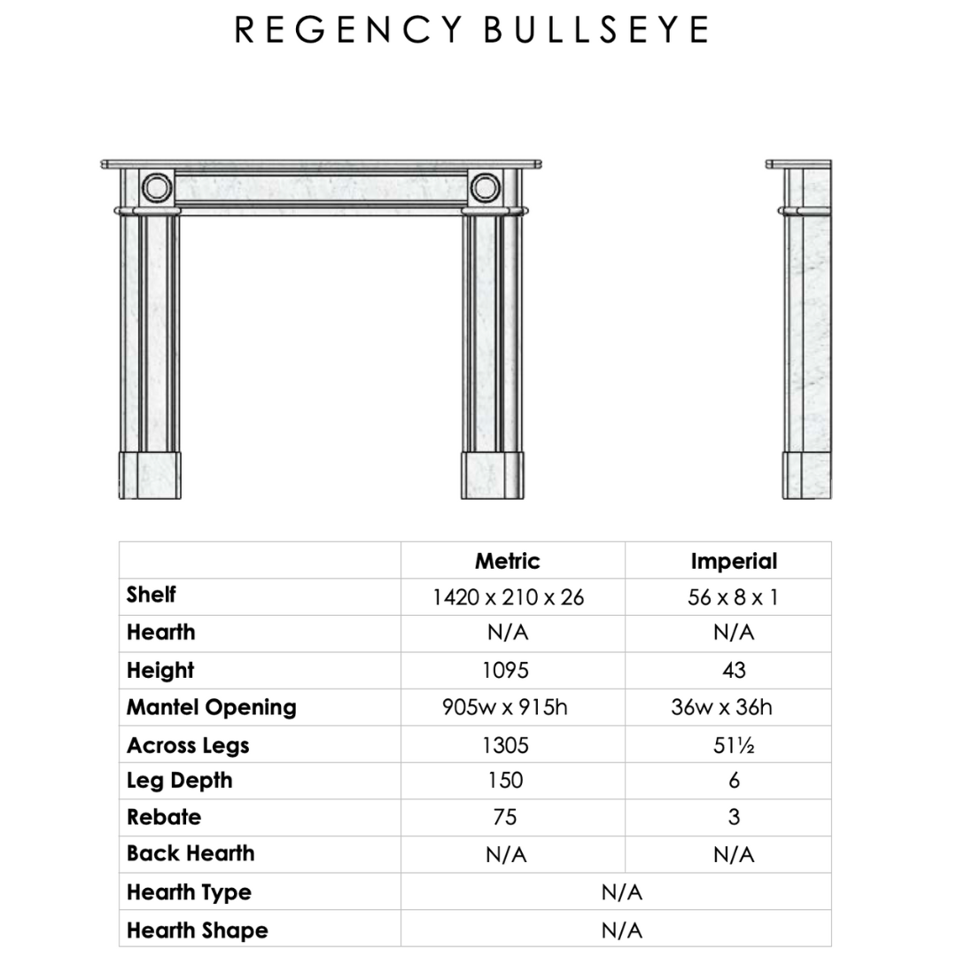 The Regency Bullseye Mantel in Carrara marble embodies timeless elegance and refined craftsmanship. Measuring 56" with a 75mm rebate, this classic fireplace surround showcases the graceful Regency Bullseye design, beautifully enhanced by the natural charm of authentic Italian Carrara stone.