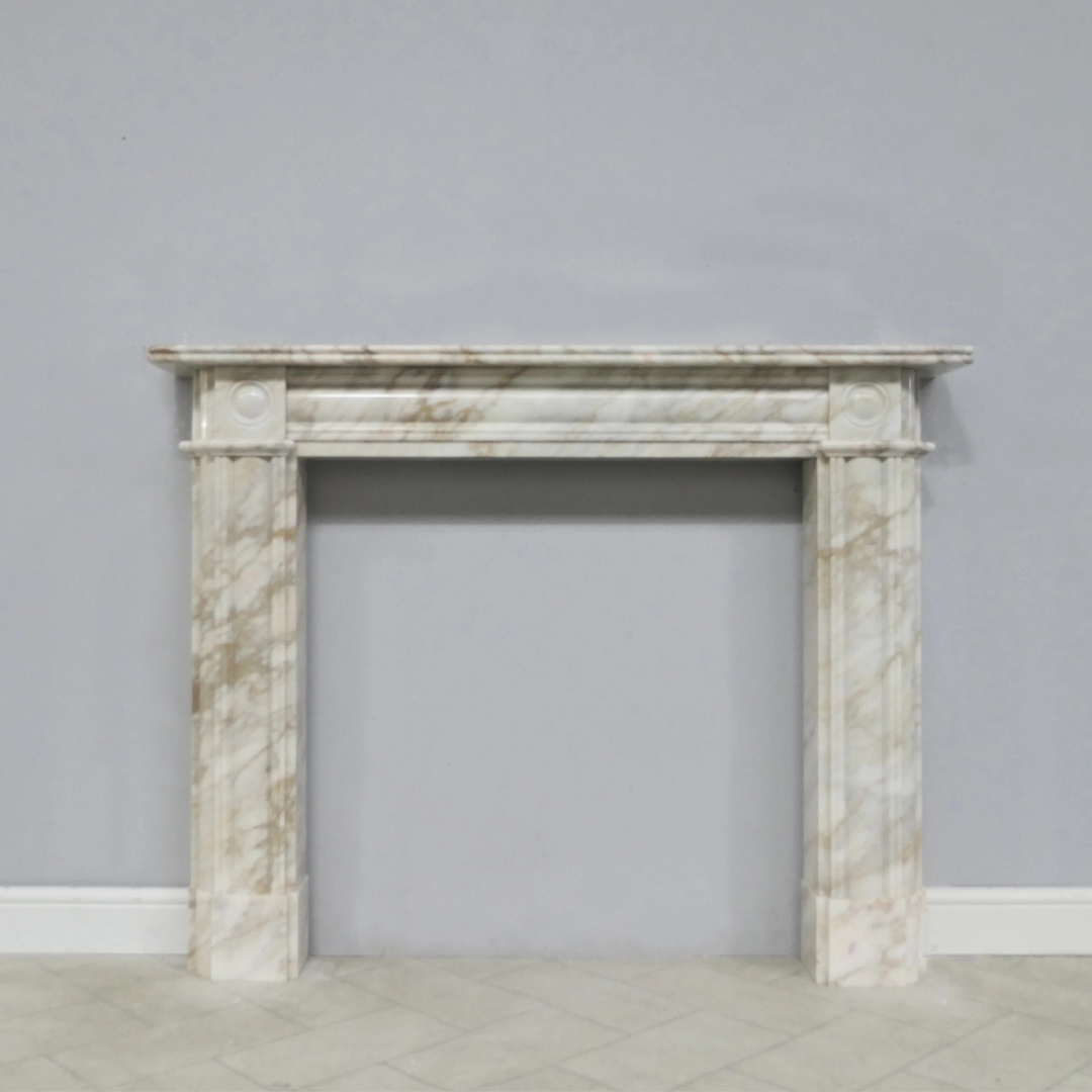 The Regency Bullseye Mantel in Dolomite Gold marble brings timeless elegance and warmth to any interior. Measuring 56" with a 75mm rebate, this beautifully proportioned fireplace surround features a traditional bullseye motif, decorative mouldings, and clean architectural lines - a true nod to classic Regency design.