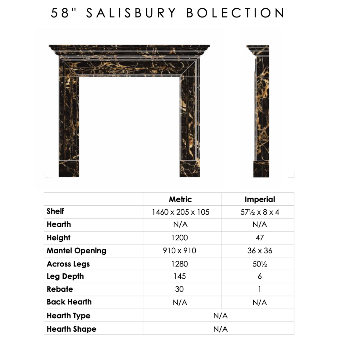 The Salisbury Bolection Mantel in Golden Portoro marble is a stunning and luxurious fireplace surround, perfect for creating a bold statement in any living space. Measuring 58" wide with a 25mm rebate, this polished mantel features classic Bolection styling with a dramatic staggered shelf, combining elegance with a touch of contemporary flair.