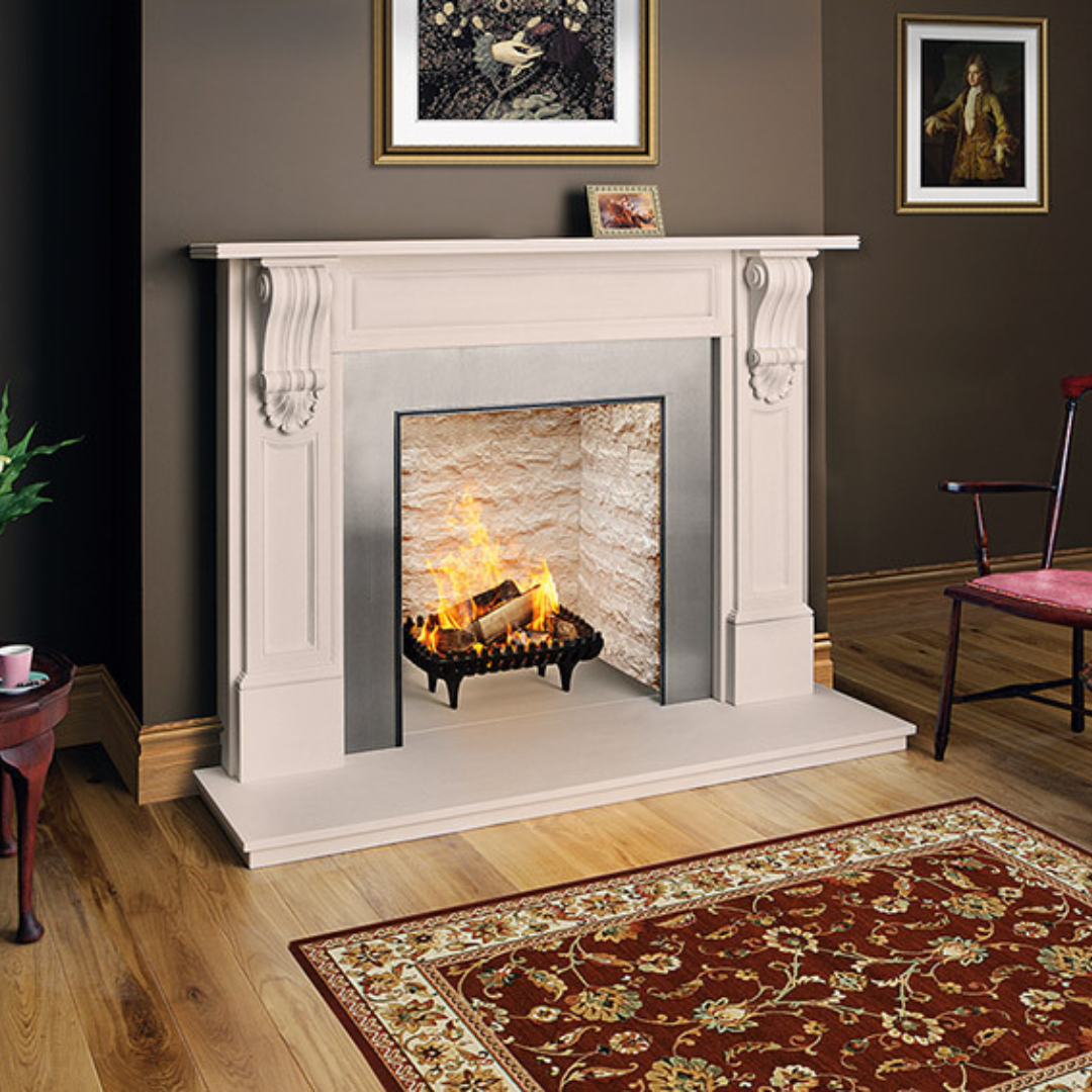 The William IV Mantel in Aegean Limestone is a traditional, decorative statement fireplace surround inspired by early 19th-century design. Measuring 60" wide with a 25mm rebate, this mantel features elegant, period detailing and bold proportions, making it the perfect centrepiece for a classic interior.
