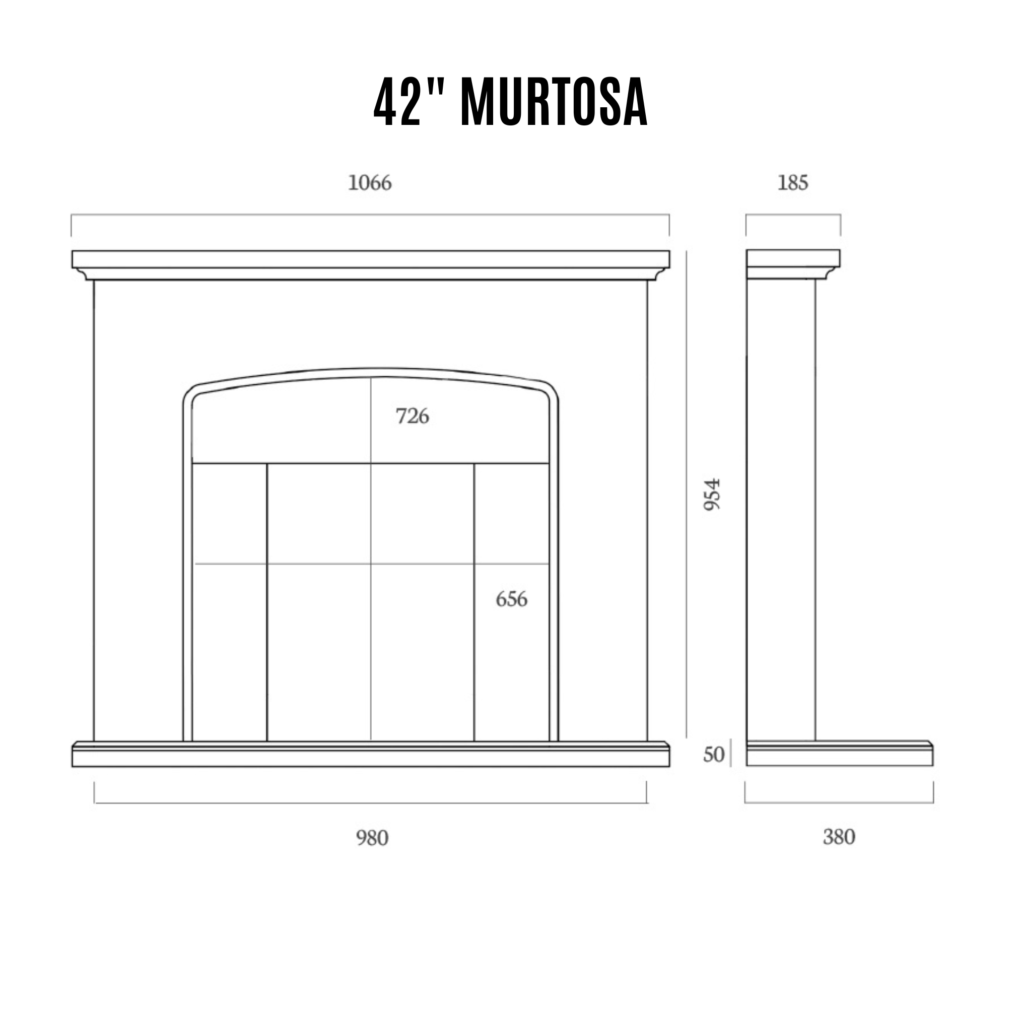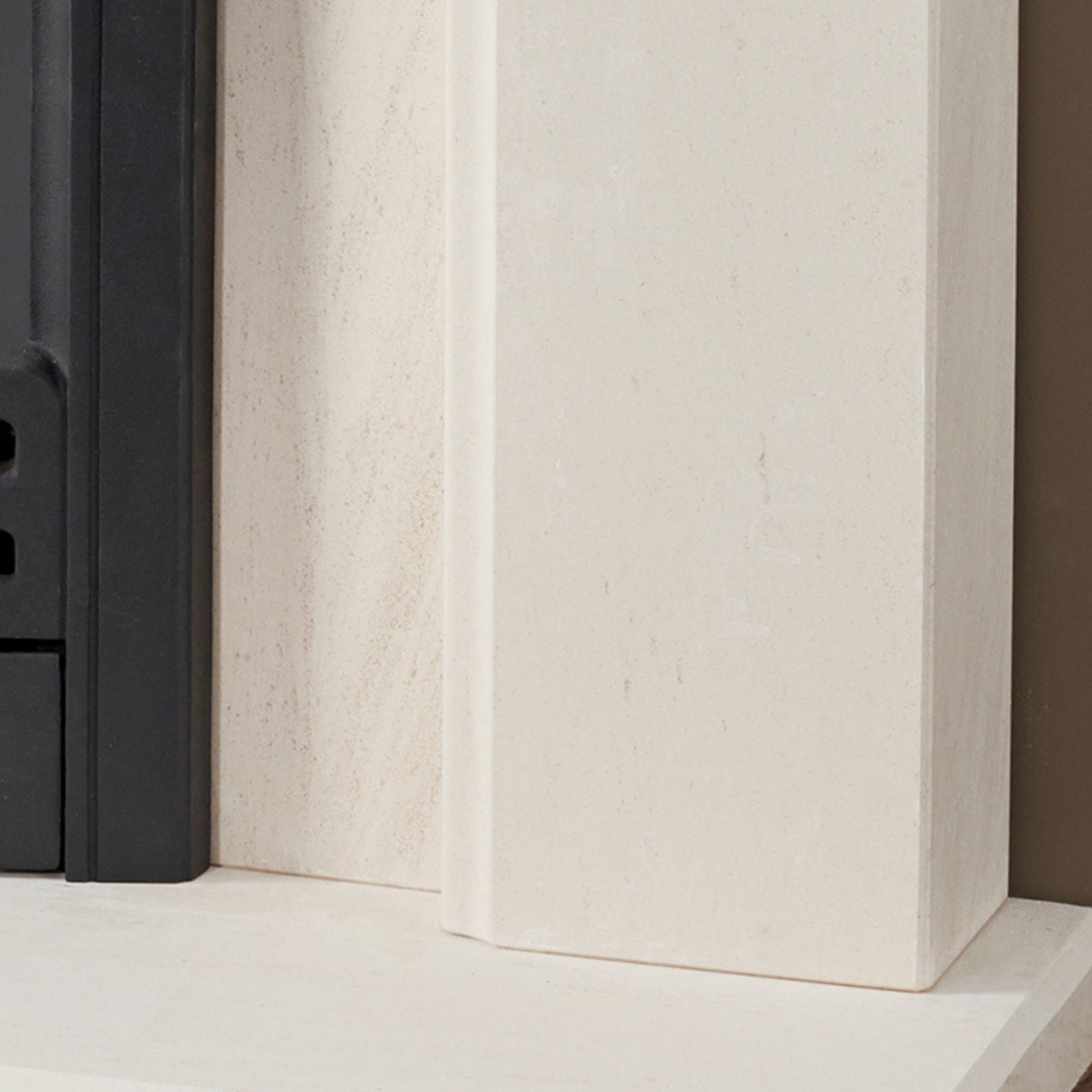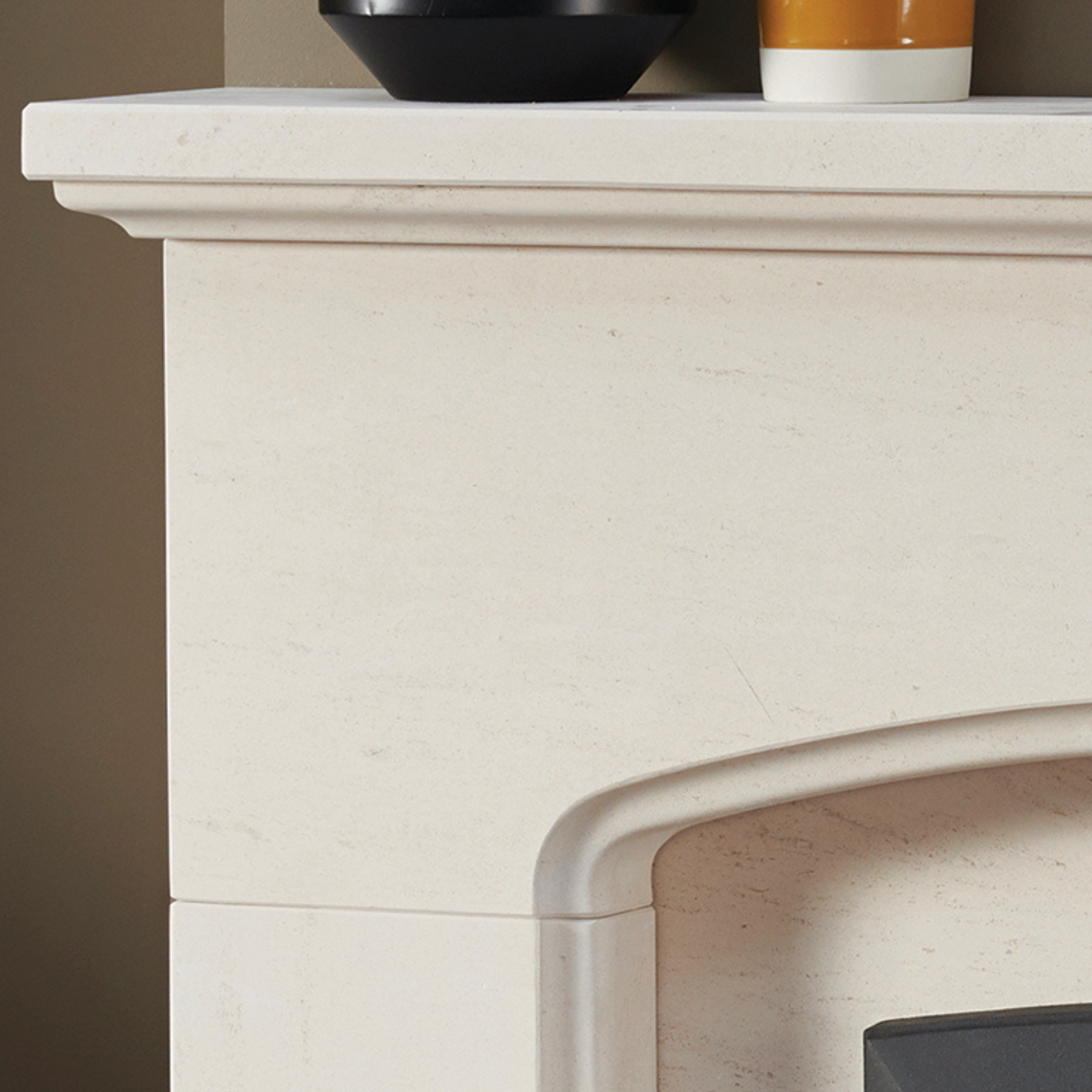 Pictured in Portuguese Limestone with the Ascella Inset Gas Fire and Black Flare Fireframe. The Murtosa is available in sizes 48″ (as shown) and 42″.