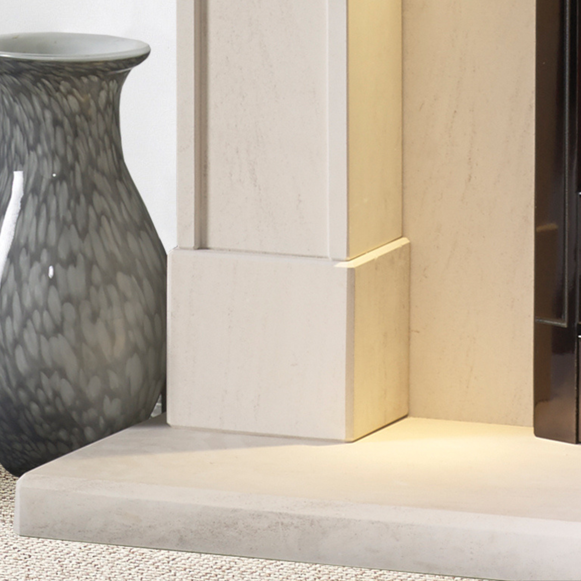 The Wilbury 48” Portuguese Limestone suite is shown here with ambient lights, Omega Inset Gas Fire and Mizar Dark Lustre Fireframe.