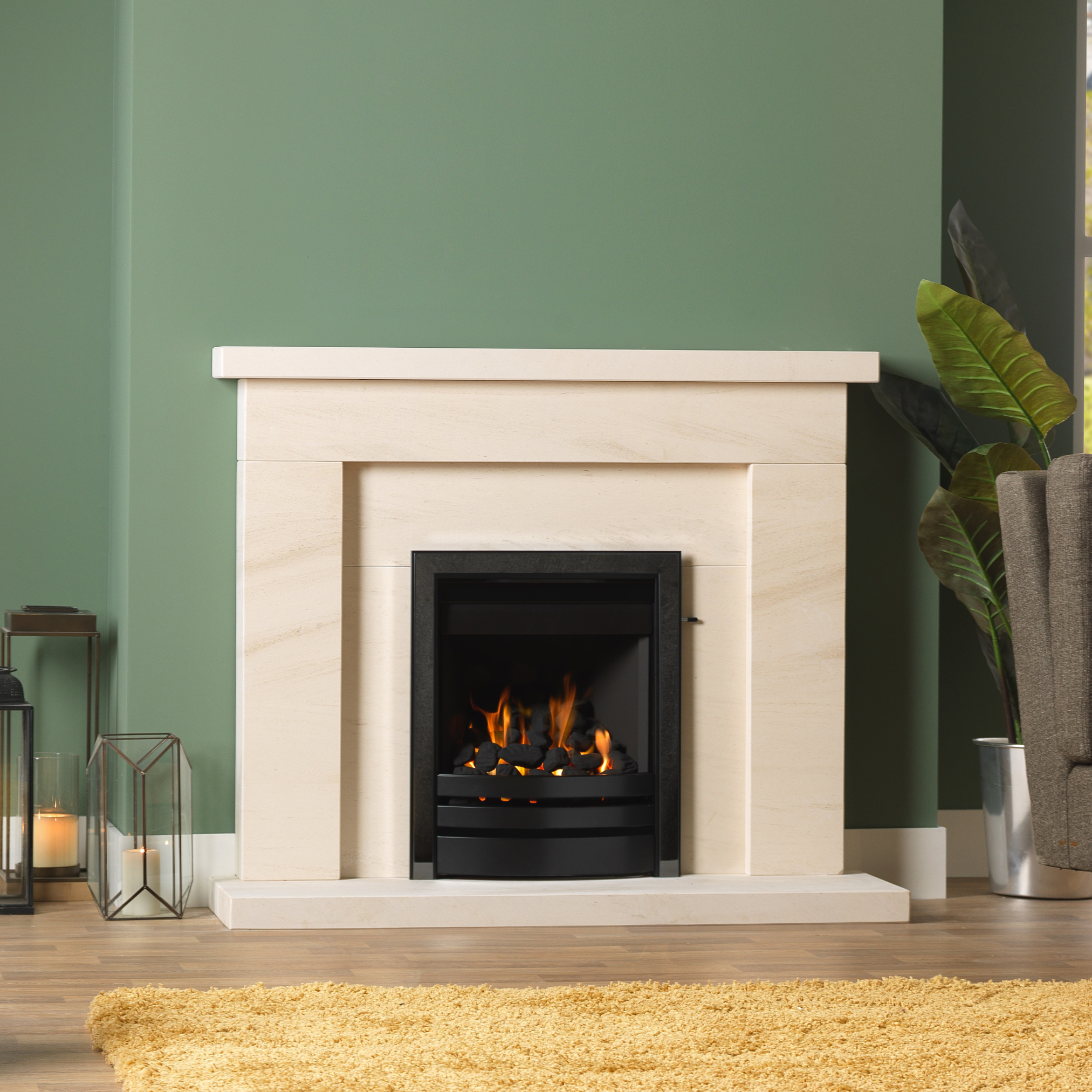 A classic design, distinctive and graceful shown in Portuguese Limestone featuring a Paragon One gas fire with black Cast Arch fascia.