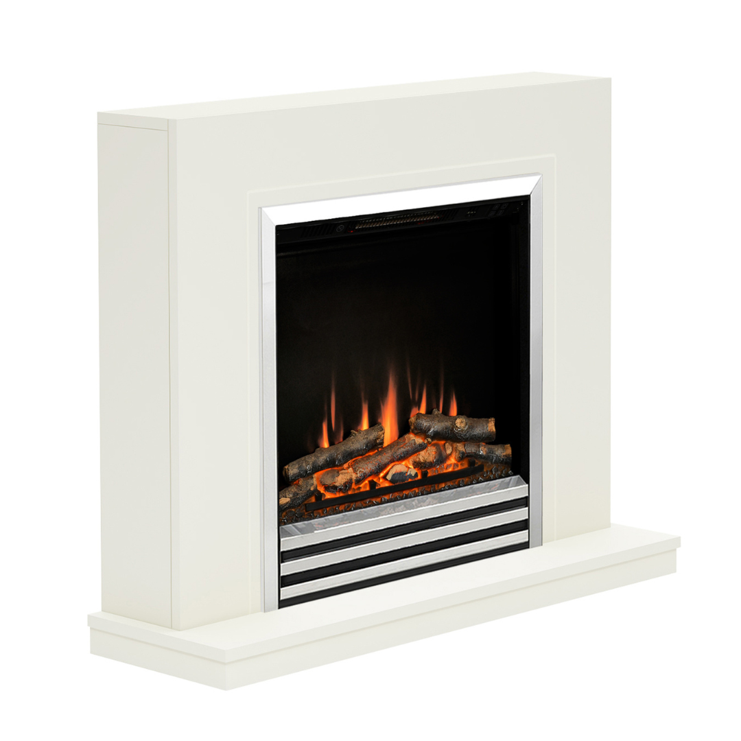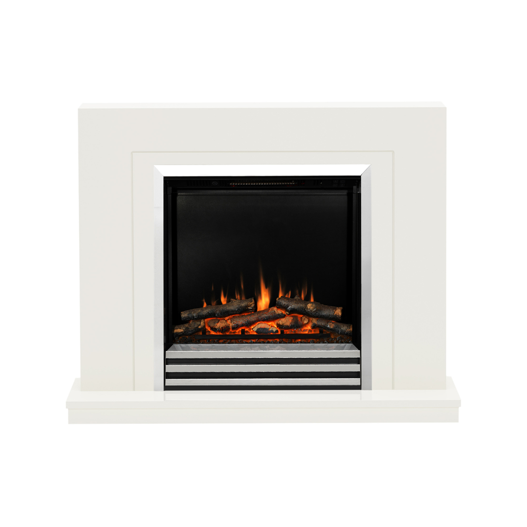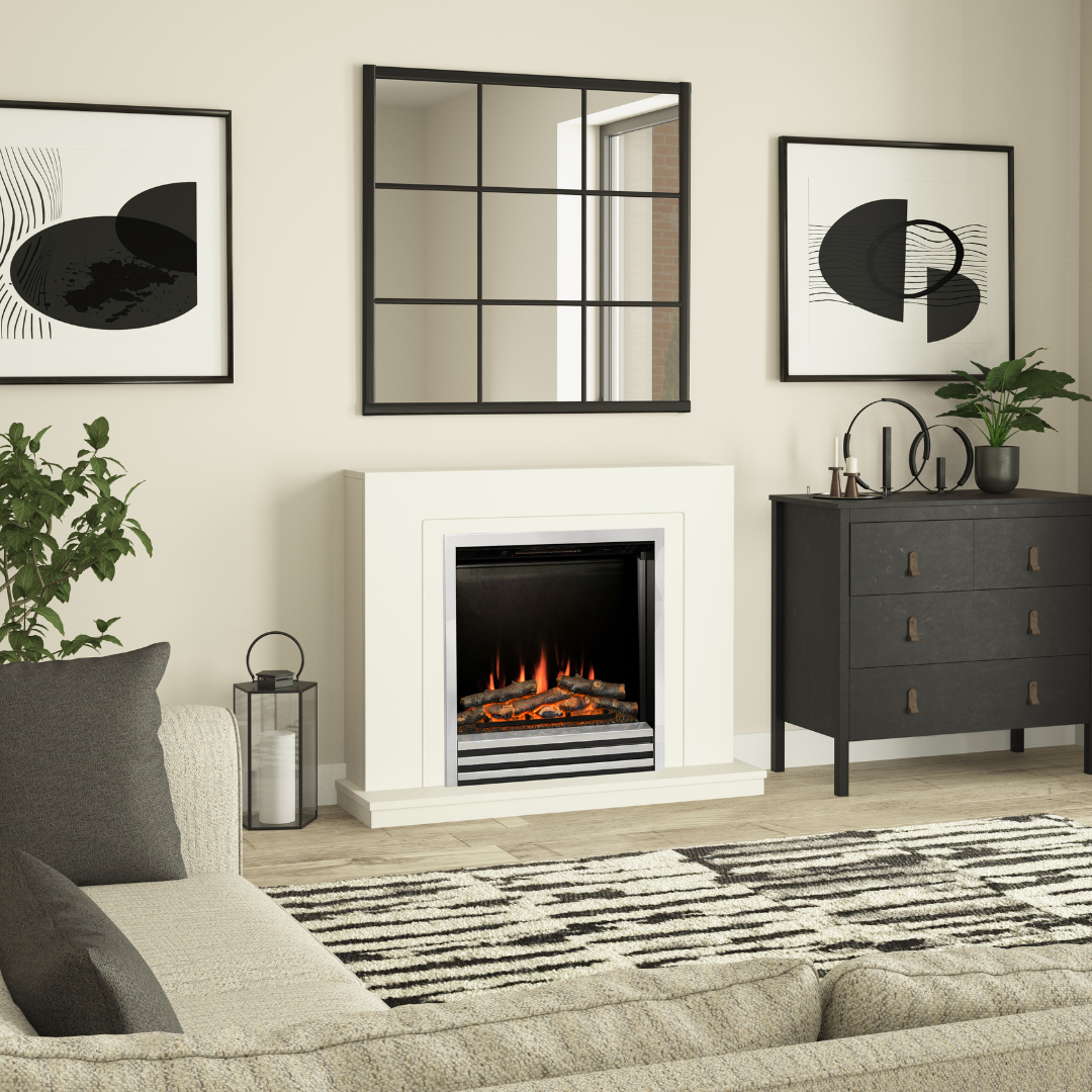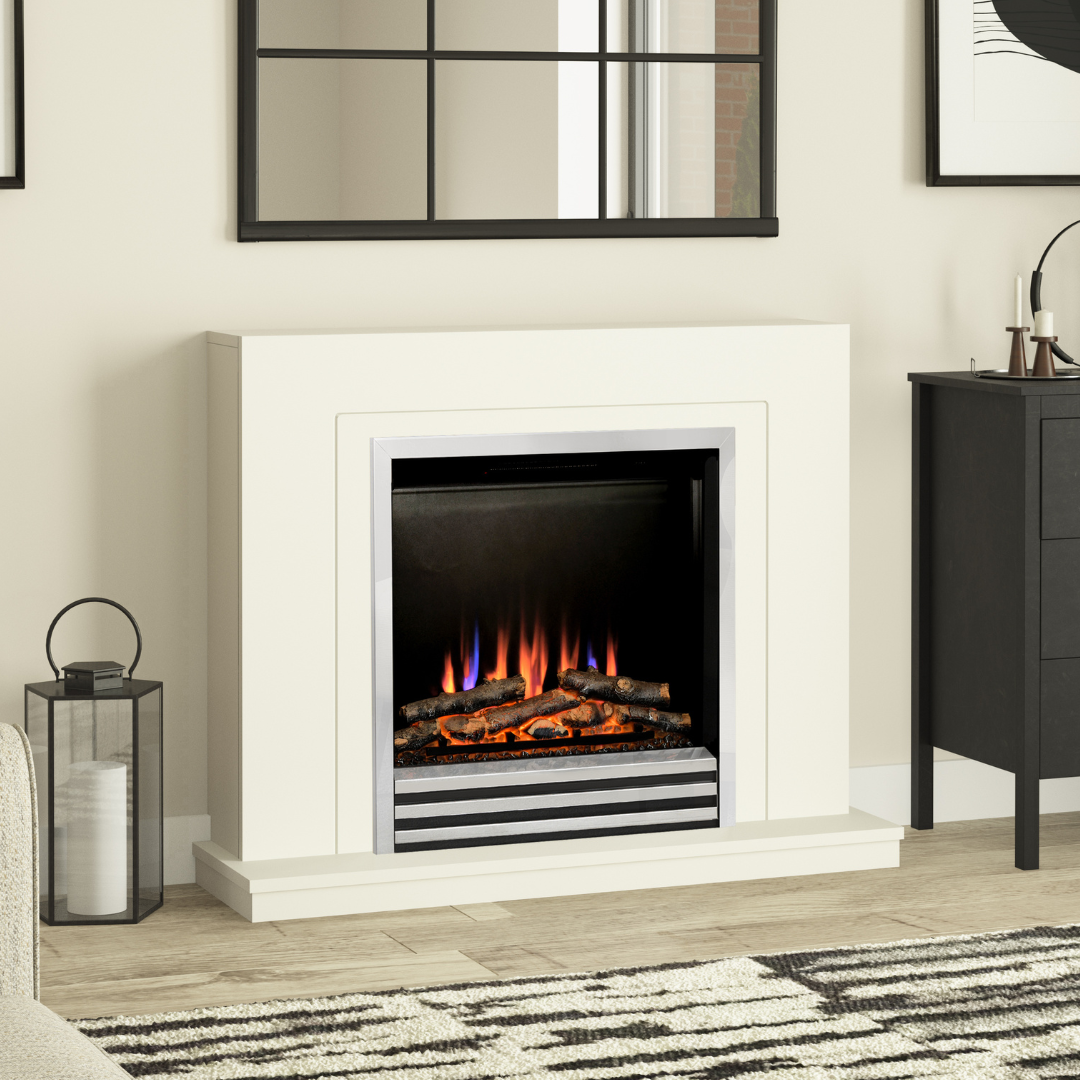 Finished in Soft White with a sleek Chrome trim, Colby blends seamlessly into modern décor while adding a subtle premium edge. The integrated widescreen electric fire features an ultra-realistic glowing log bed and a mesmerising flame effect, giving you a cosy fireside feel at the flick of a switch.