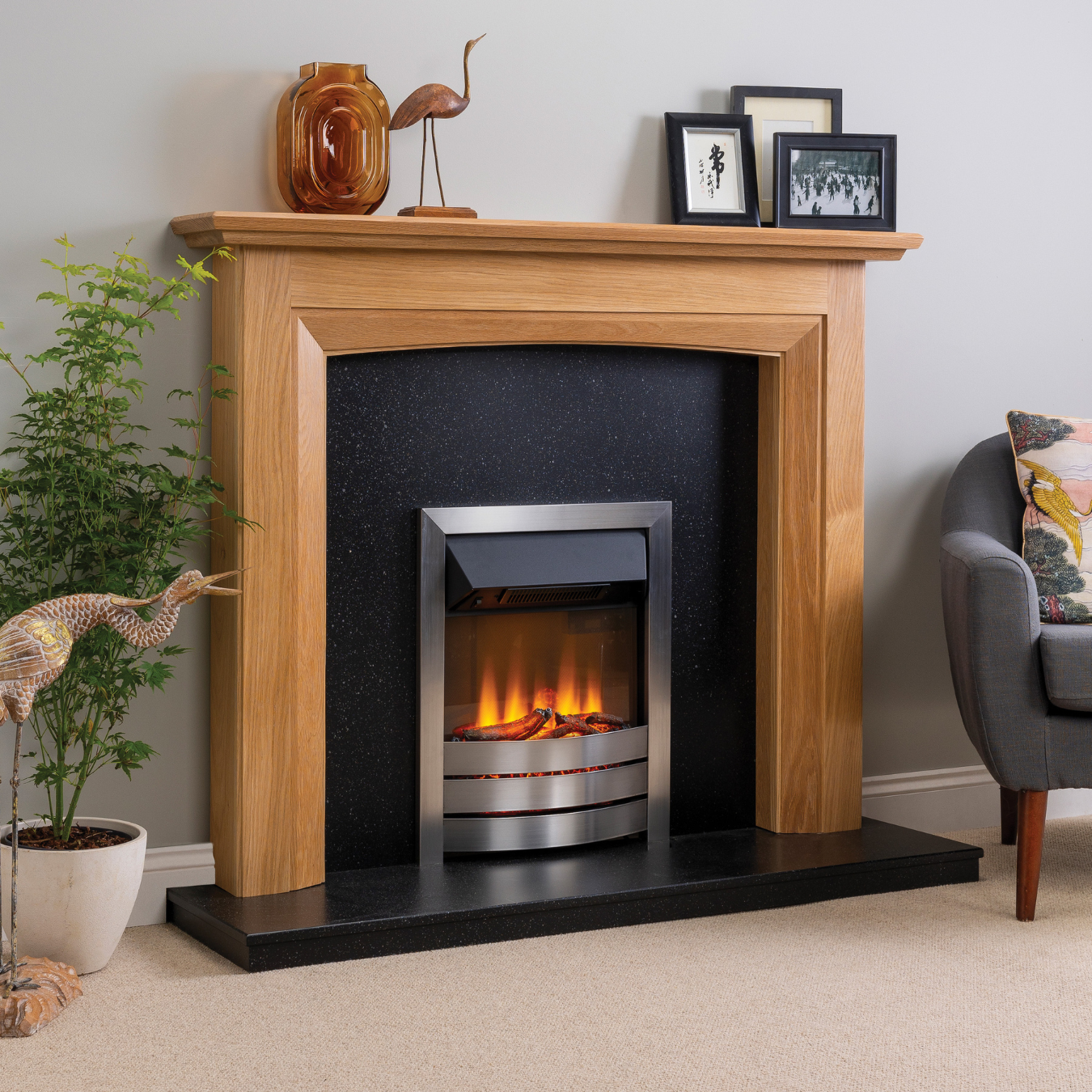 Part of the Heritage Collection, the Malham Solid Oak fireplace mantel features a curved mantel with bevelled detail. Pictured here in its standard 53.75″ width, the image displays the Malham finished in Waxed Oak. This mantel can also be made to measure to your exact specifications for a seamless fit in your living space.