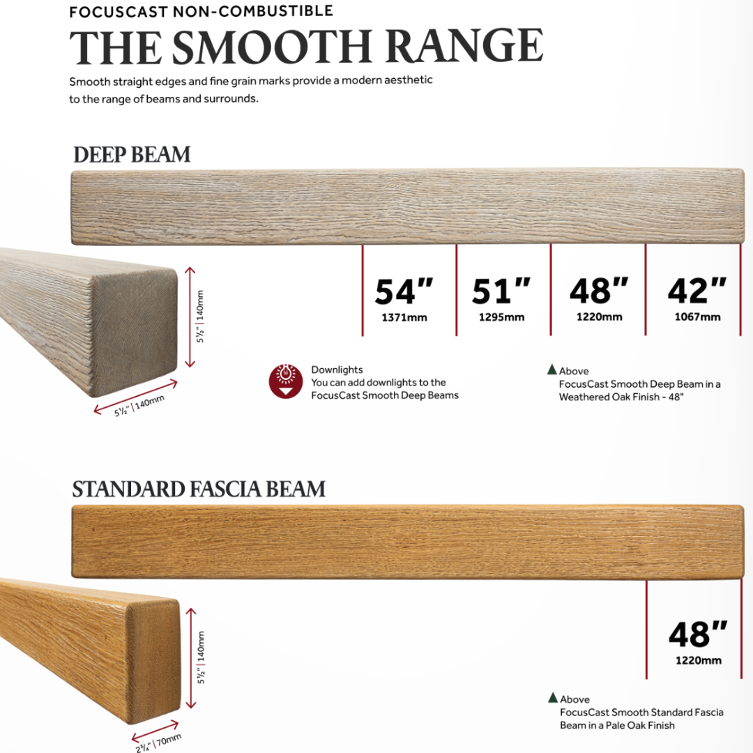 FocusCast Mantel Beams and Stove Surrounds are moulded from timber and stone beams using a high-density mineral composite material that can endure extreme exposure to heat and flames and will not ignite. This fire-resistance allows the FocusCast products to be positioned closer to a stove than a timber beam.
