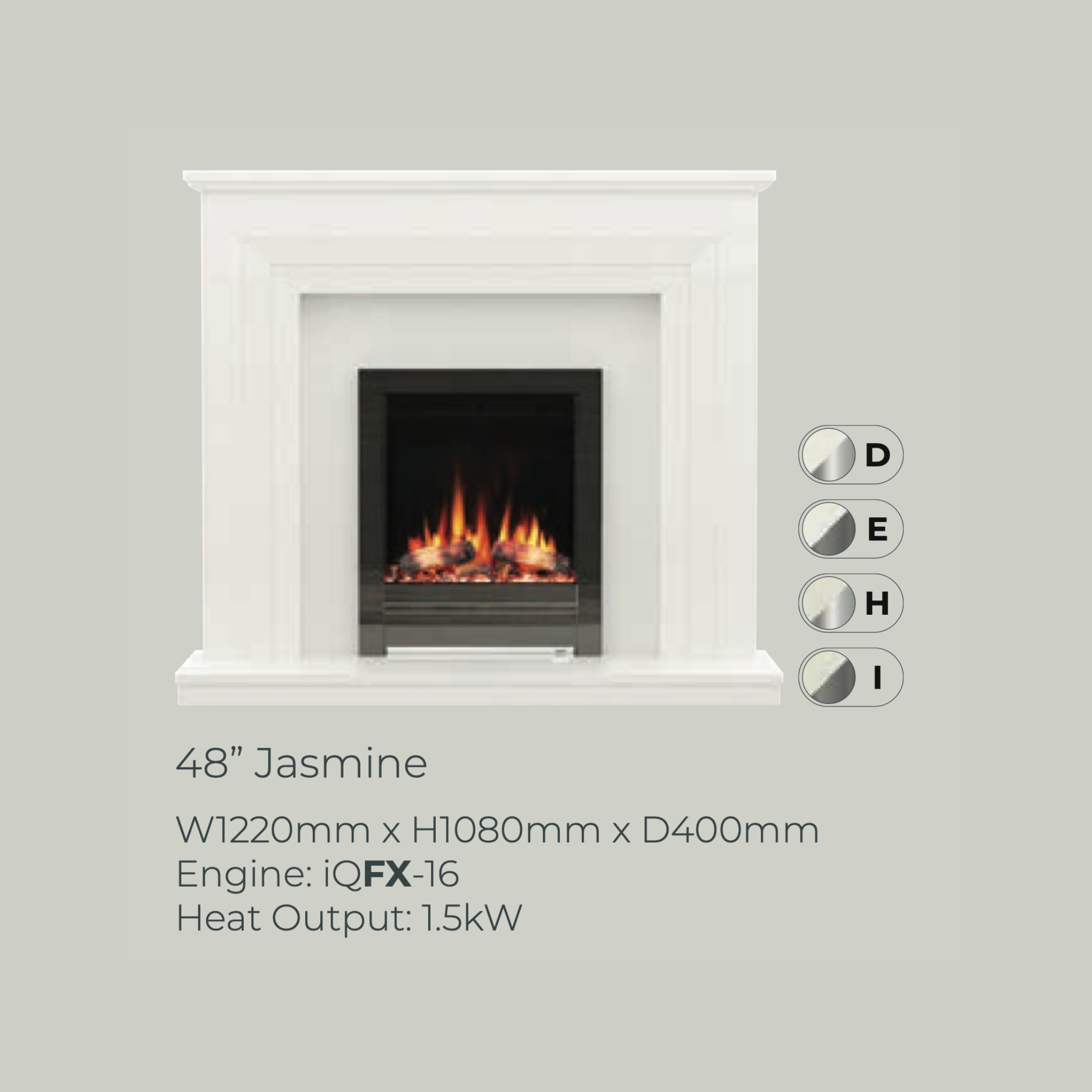 The collection features 13 contemporary fireplace designs, available in widths ranging from 47"-57", wall mounted and floor standing options, and in a selection of 3 elegant colours.