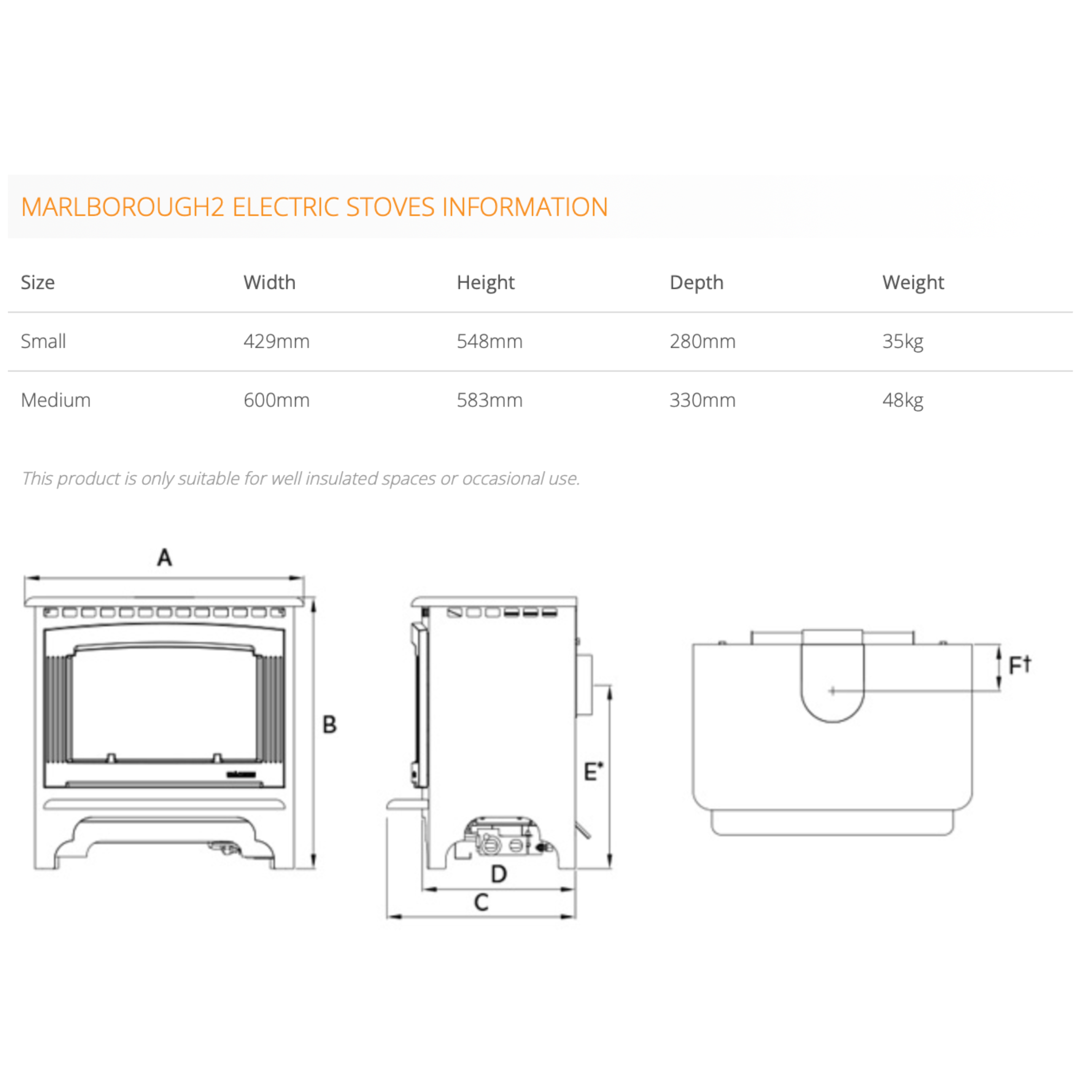 The Gazco Marlborough2 electric range combines Art Deco styling with country influences for an eye-catching electric stove collection. Two sizes ensure these electric stoves can fit a variety of settings, and each needs only a 13amp plug socket to bring instant ambience to your home.