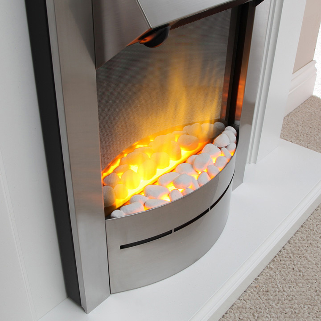 Part of the efficient Ecolite range, Savena uses low-energy LED lighting to keep running costs down while delivering a bright, realistic flame picture. A moulded fuel bed (pebbles/coal) adds authentic texture, and the simple side-switch controls make everyday use effortless.