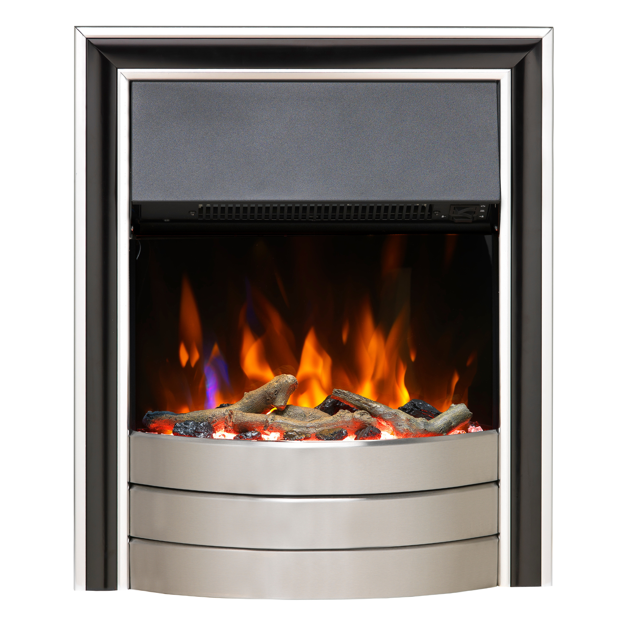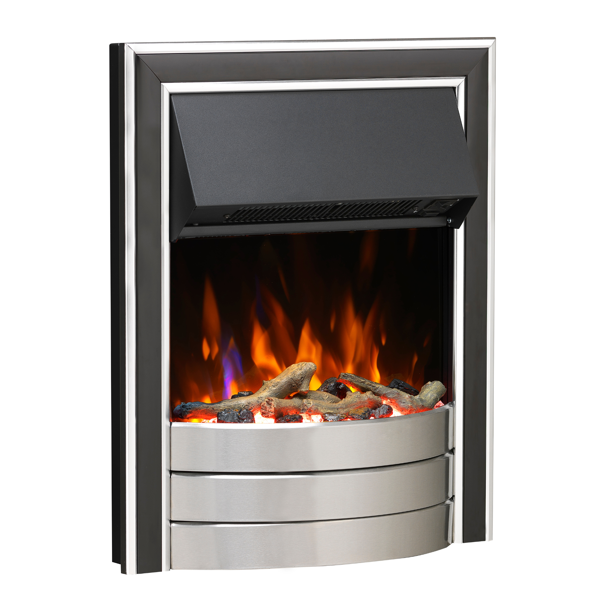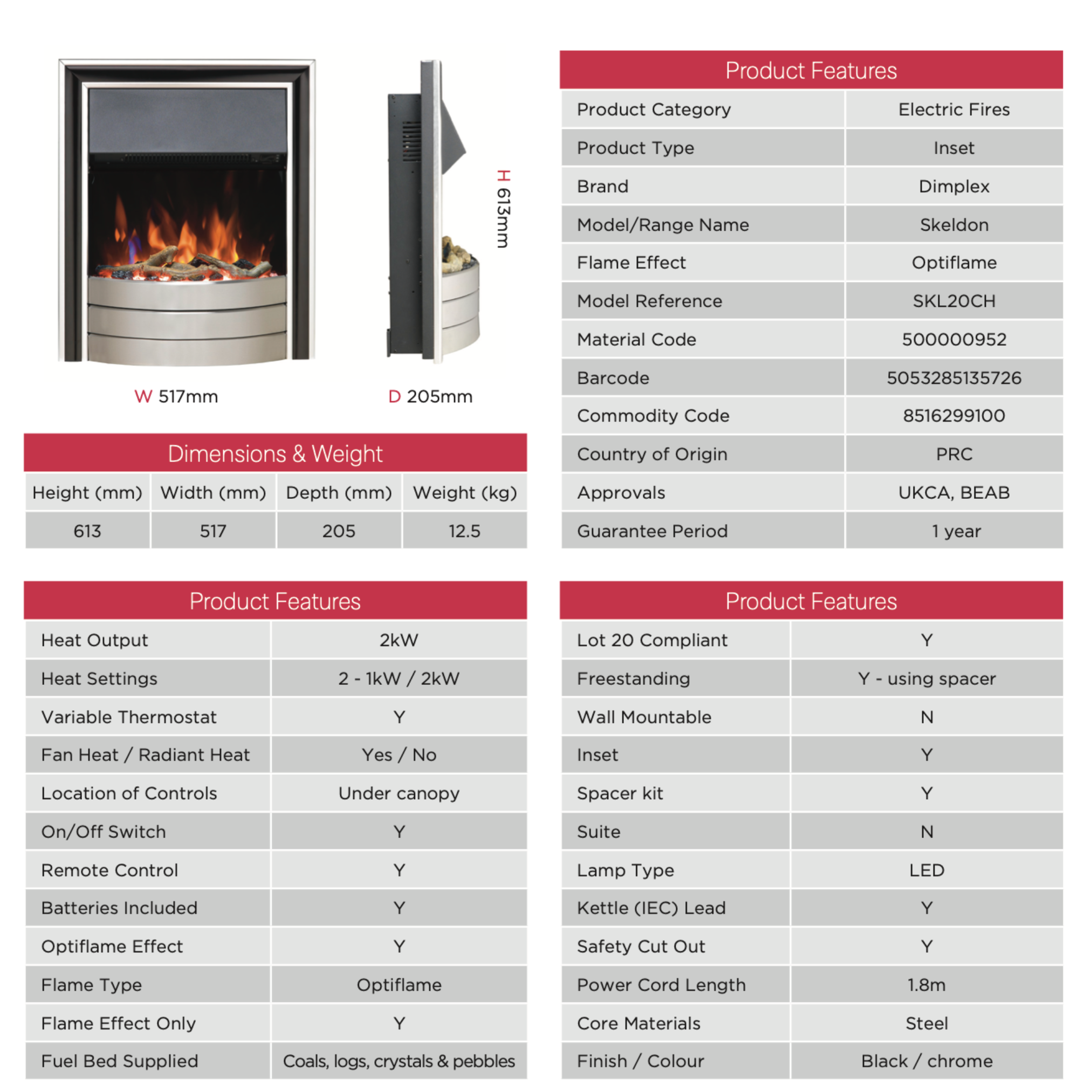 Offering a stylish modern design, the Skeldon inset electric fire is a great choice for refreshing your living space. Available in a black and brushed chrome finish, with extruded trim and a host of features, the Skeldon's warm glow makes it the perfect choice.The Skeldon features the very latest in Optiflame technology with a multi-coloured LED flame, downlight, fuel bed lighting option and adjustable flame brightness, the result is a truly unique experience and a perfect centrepiece in any home.Controlled by the easy-to-use remote control or the manual controls located on the top right had side of the fire this model has a range of features including a thermostat, a runback timer and 2kW heat output with two heat settings. The flame-effect can be used independently of heater, offering the benefit of a cosy atmosphere even when heat is not required.The beauty of a real fire, the simplicity of electric.