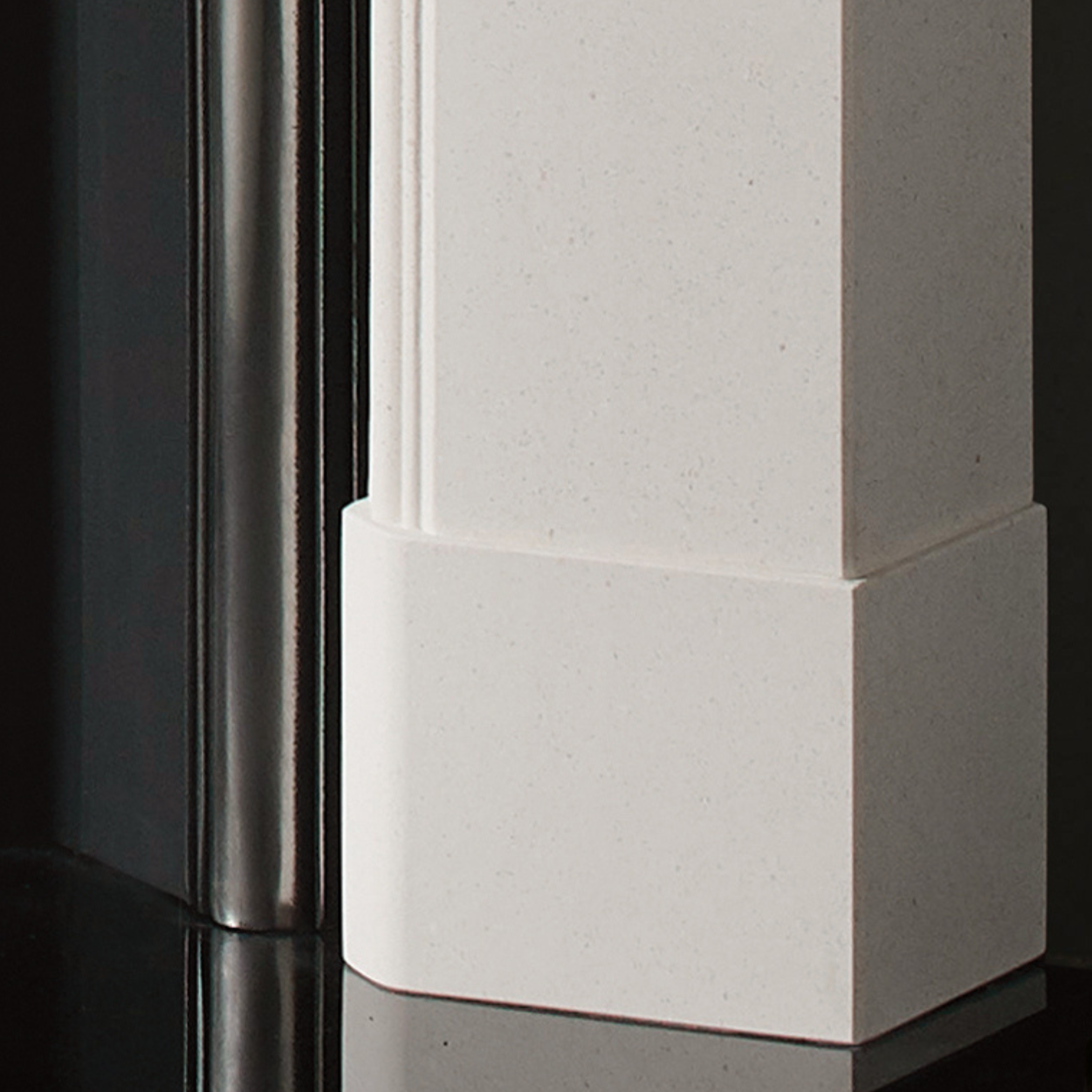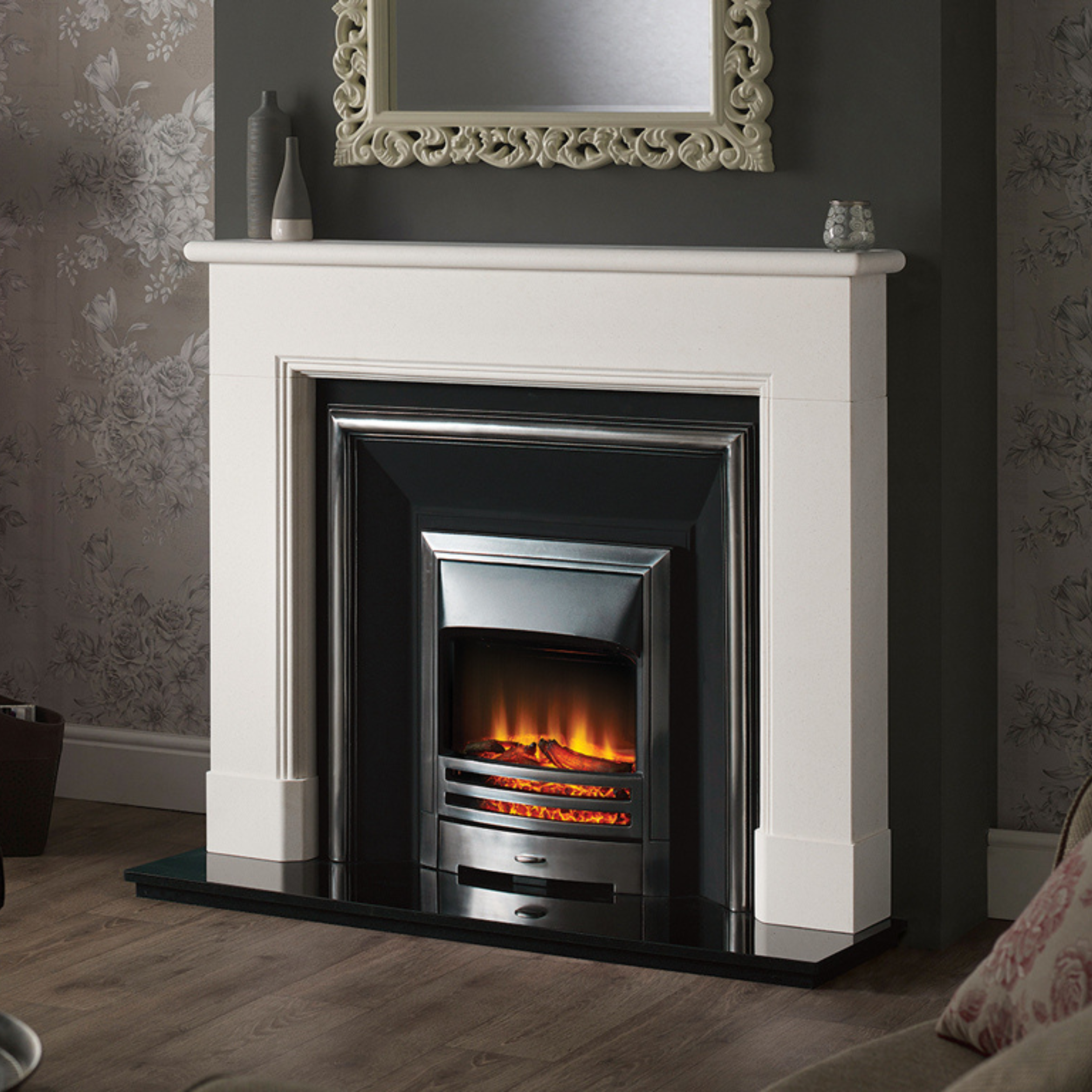 Pictured in Aegean Limestone with Polished Granite Slips, Design Line 800 Gas Fire with a Black Glass Interior and Polished Granite Hearth.