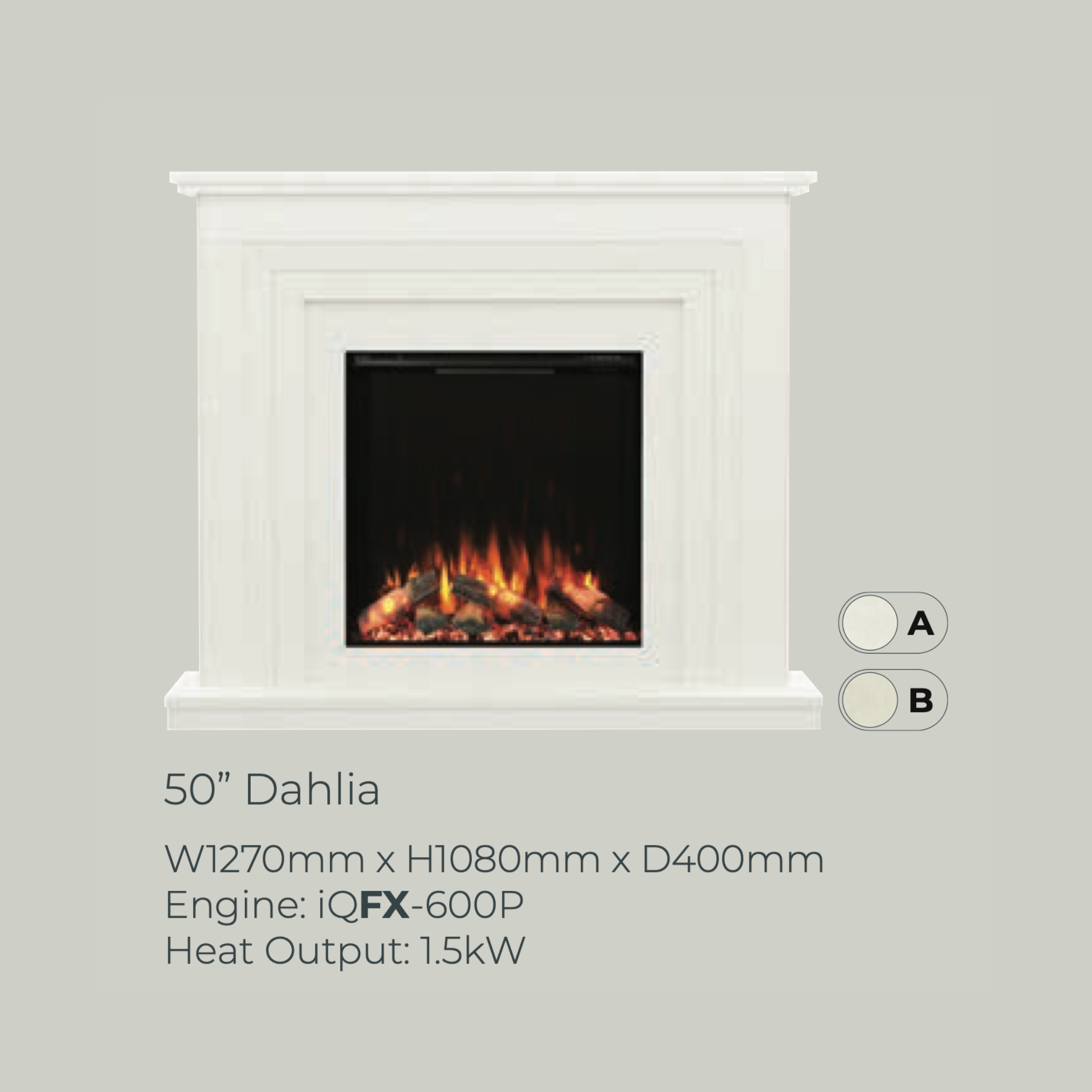 The collection features 13 contemporary fireplace designs, available in widths ranging from 47"-57", wall mounted and floor standing options, and in a selection of 3 elegant colours.