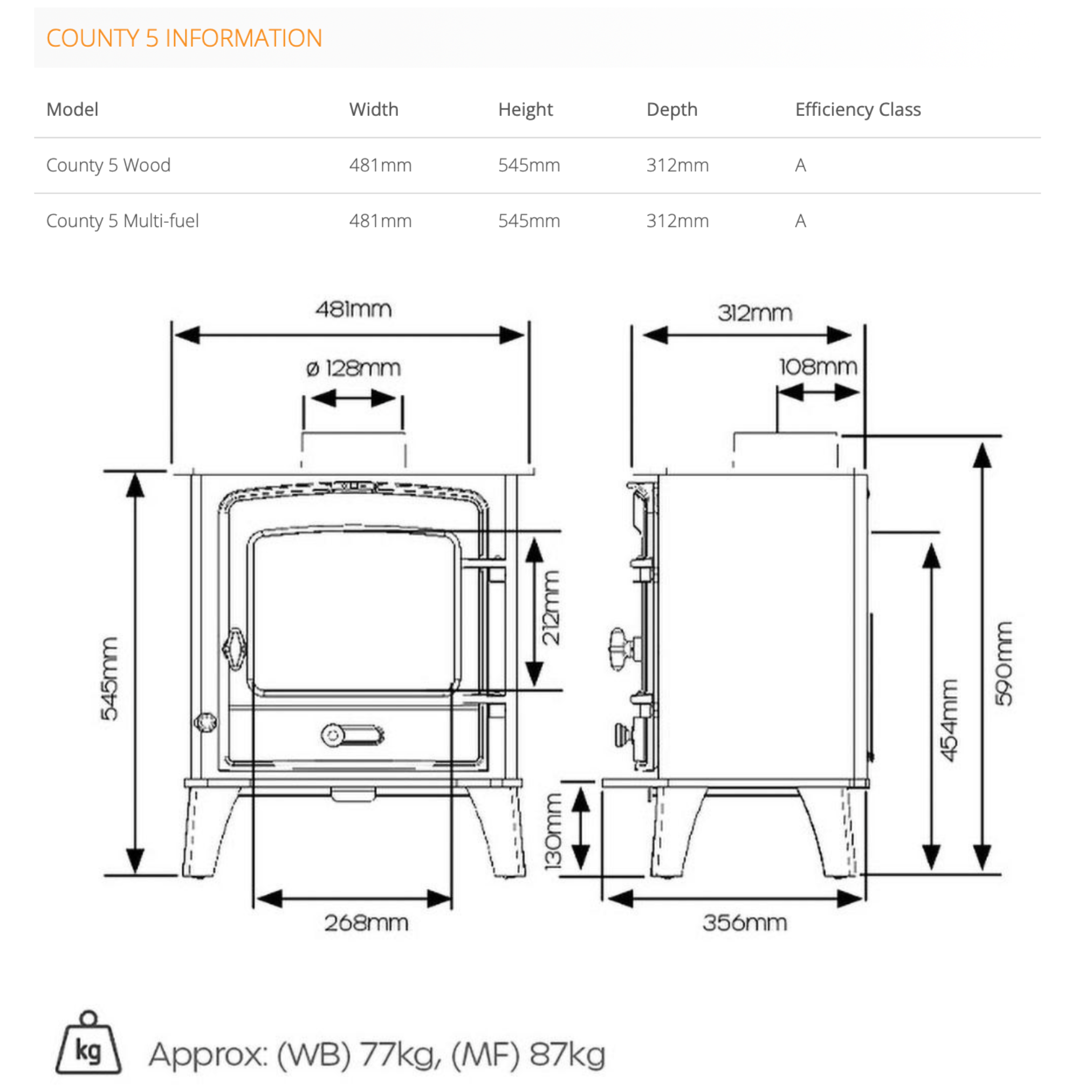 The Ecodesign Plus Stovax County 5 wood burning and multi-fuel stove combines timeless styling with advanced combustion systems. As a mid-size stove that is larger than the County 3, the expansive glass window offers a superb view of the flames, while powerful Airwash jets keep the glass panel clear for impressive visuals. The charming rustic exterior is designed to suit both traditional and modern interiors and responsive slide controls adjust airflow for easy heat management. Inside the Cleanburn airflow systems help to minimise emissions, and being Ecodesign and DEFRA exempt as standard means it’s suitable for use in Smoke Control Areas. The County 5 is available as a dedicated wood burning stove, as well as a multi-fuel version with external riddling.
