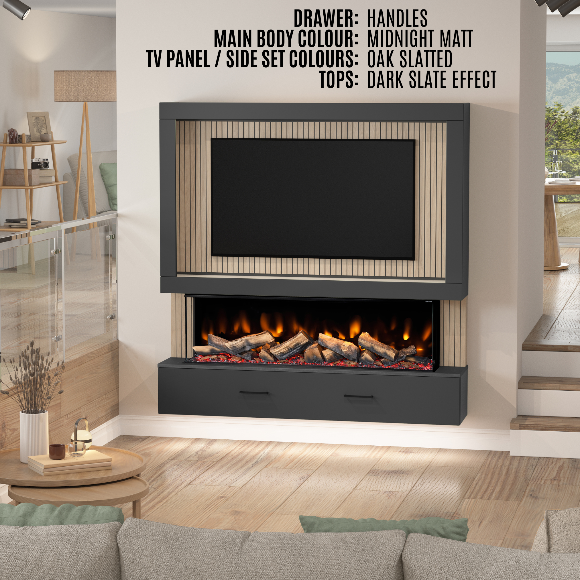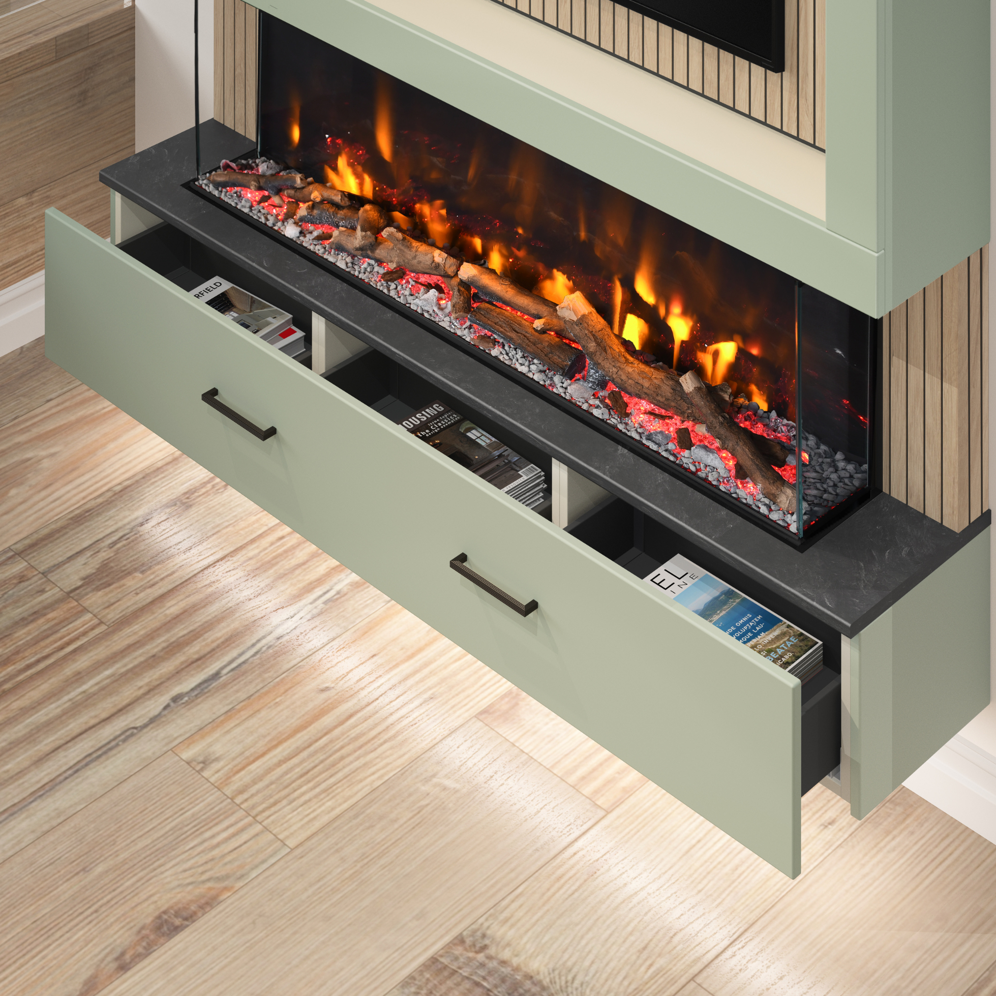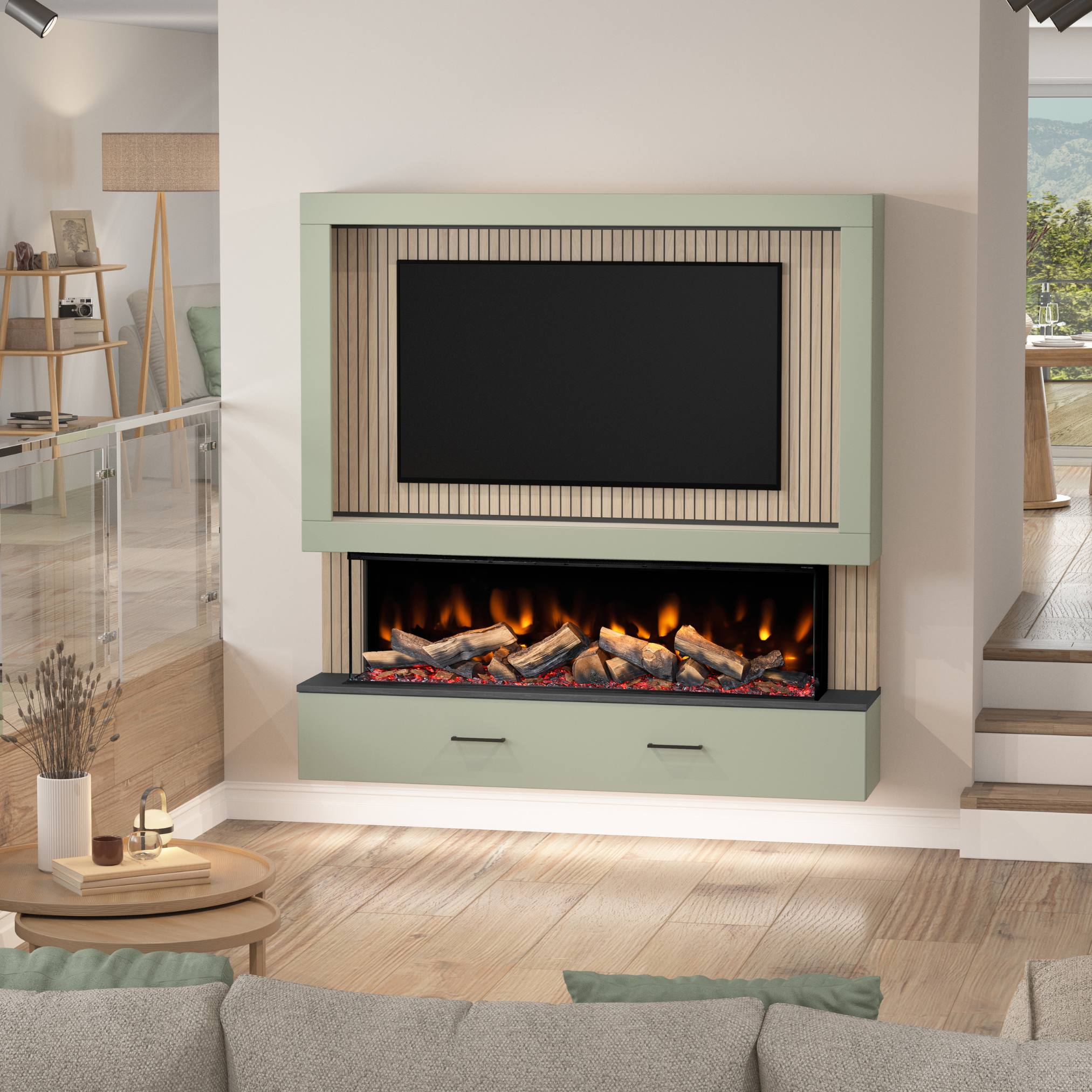 Pre-built media wall fireplaces offer a unique DIY installation with a premium construction & finish, including a luxurious ARTEON 1.5m wide 3 sided electric fire. Choose between 9 matt finishes with optional Oak Panelling. Integrated cable management with space to house up to 65" TVs and your soundbar.