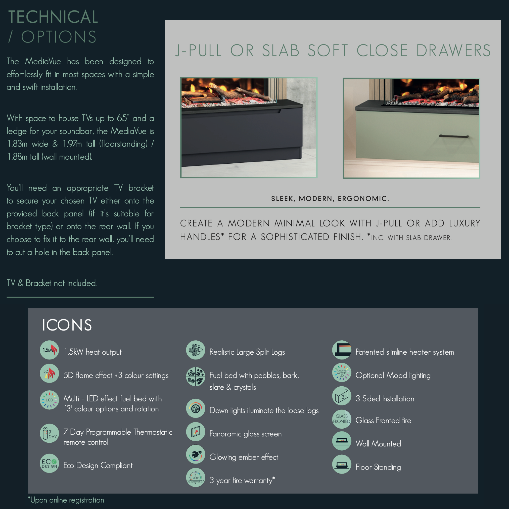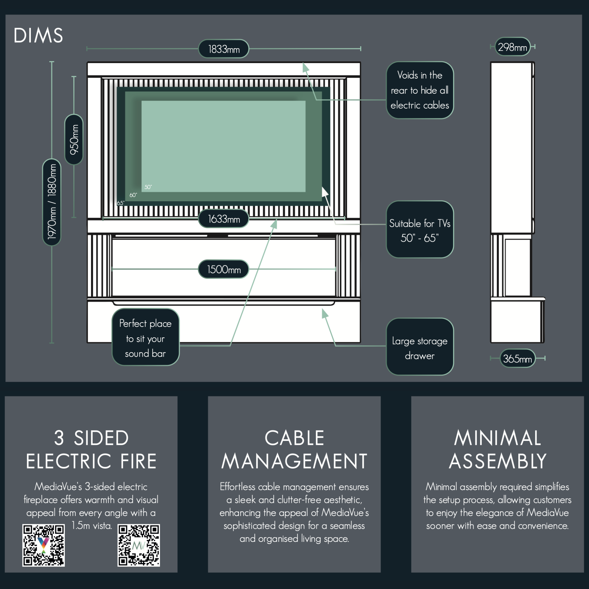 The MediaVue is a pre-built media wall fireplace with a unique DIY installation offering a premium construction & finish, including a luxurious 1.5m wide 3 sided electric fire. Designed and built by BeModern Ltd. who have been manufacturing bathroom furniture and electric fires for over 60 years, rest assured, the quality is unparalleled.