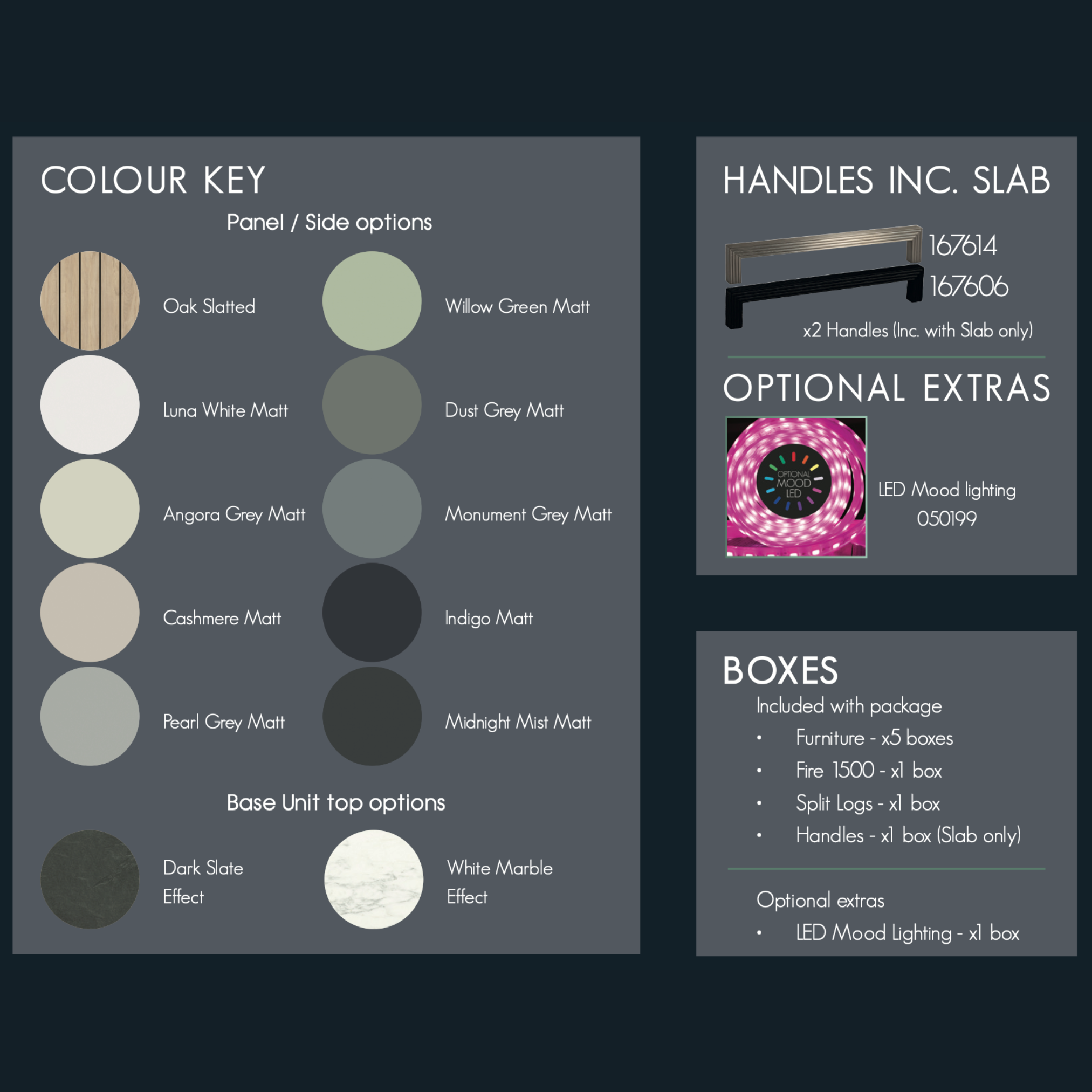 - Flame 3 x Colour Options + 5 Dimmable Settings