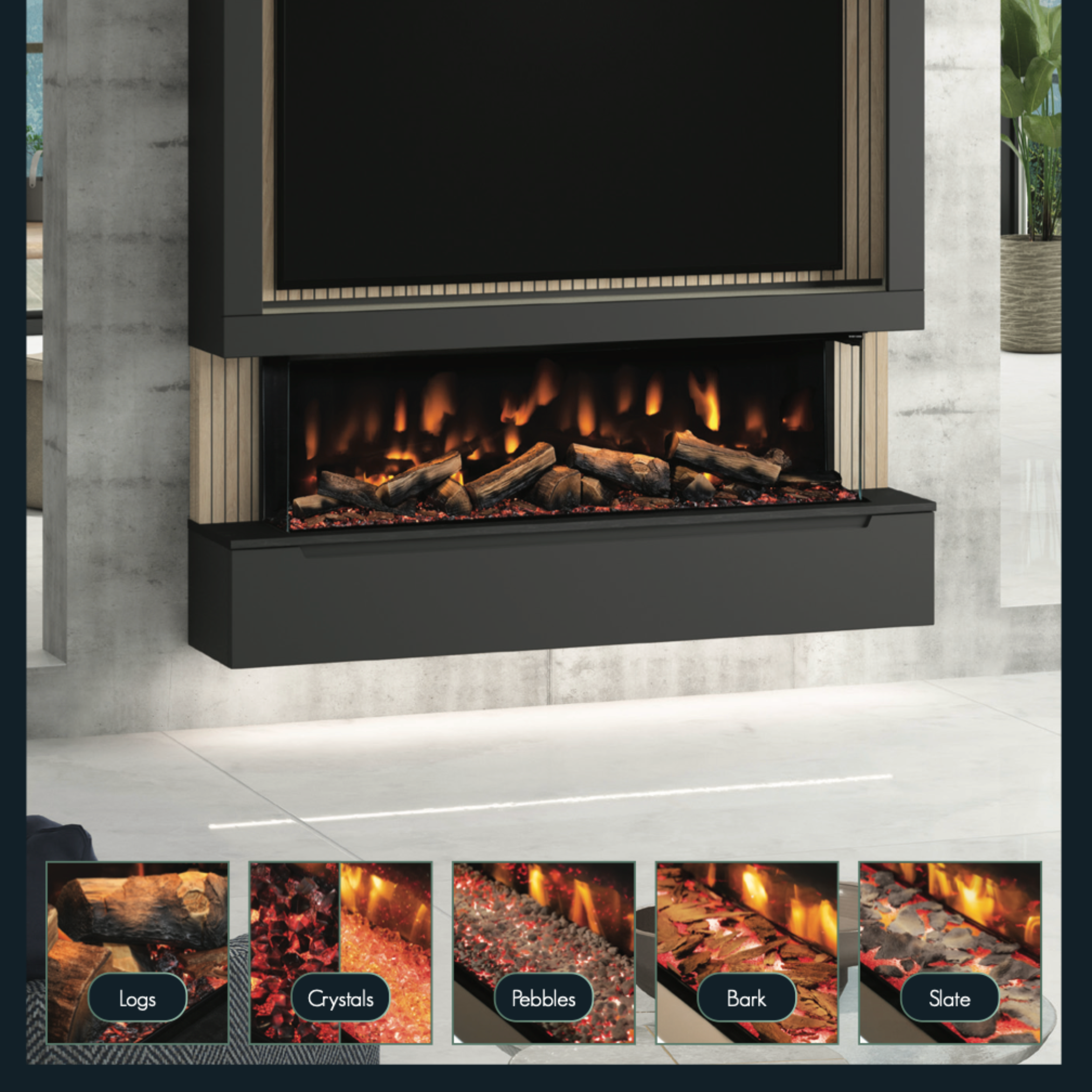 - Fuel Bed includes, Split Logs, Smoke Crystals, Crystallised Pebbles & Bark