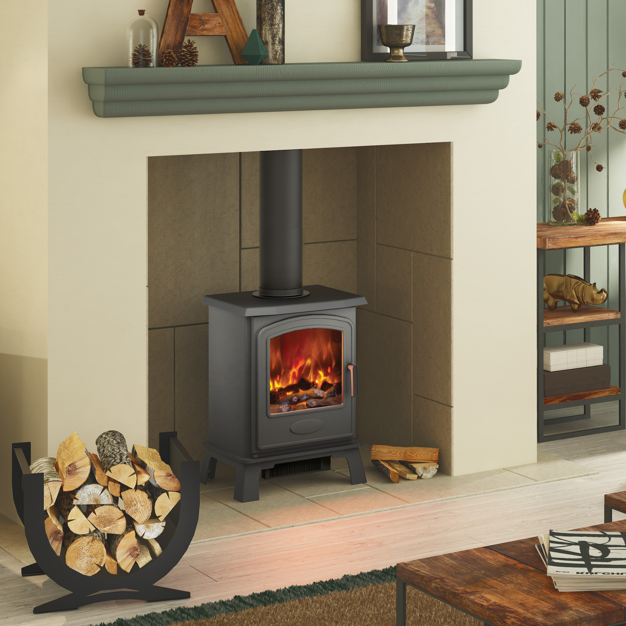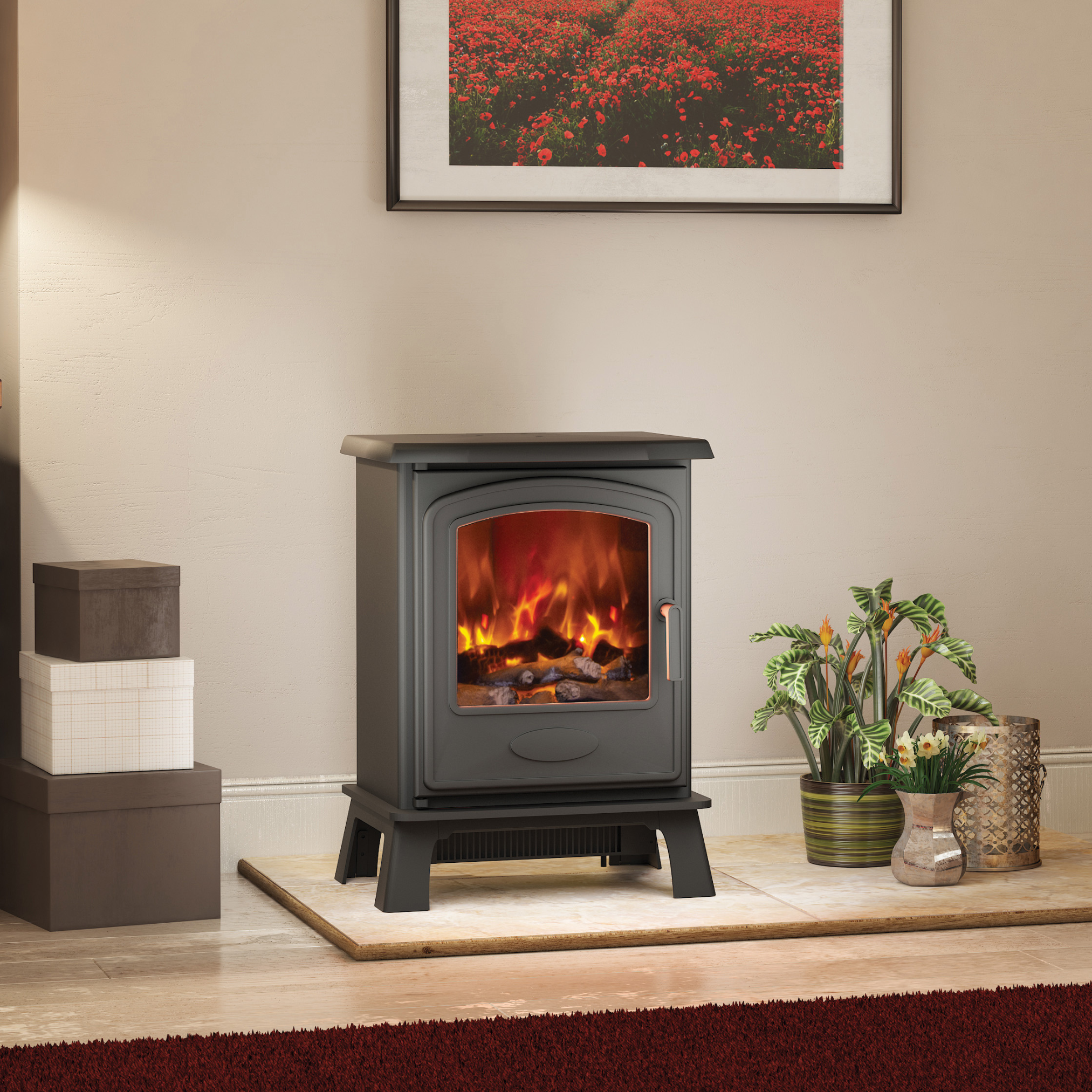The traditional Ora 5 & 7 freestanding electric stove boasts a gentle arched window set into a Cast Iron door with Steel body. Beautifully finished in Matt Black, the realistic glowing log bed shimmers beneath the dancing flames; enjoy up to 2kW heat or flame effect only, saving energy and money.