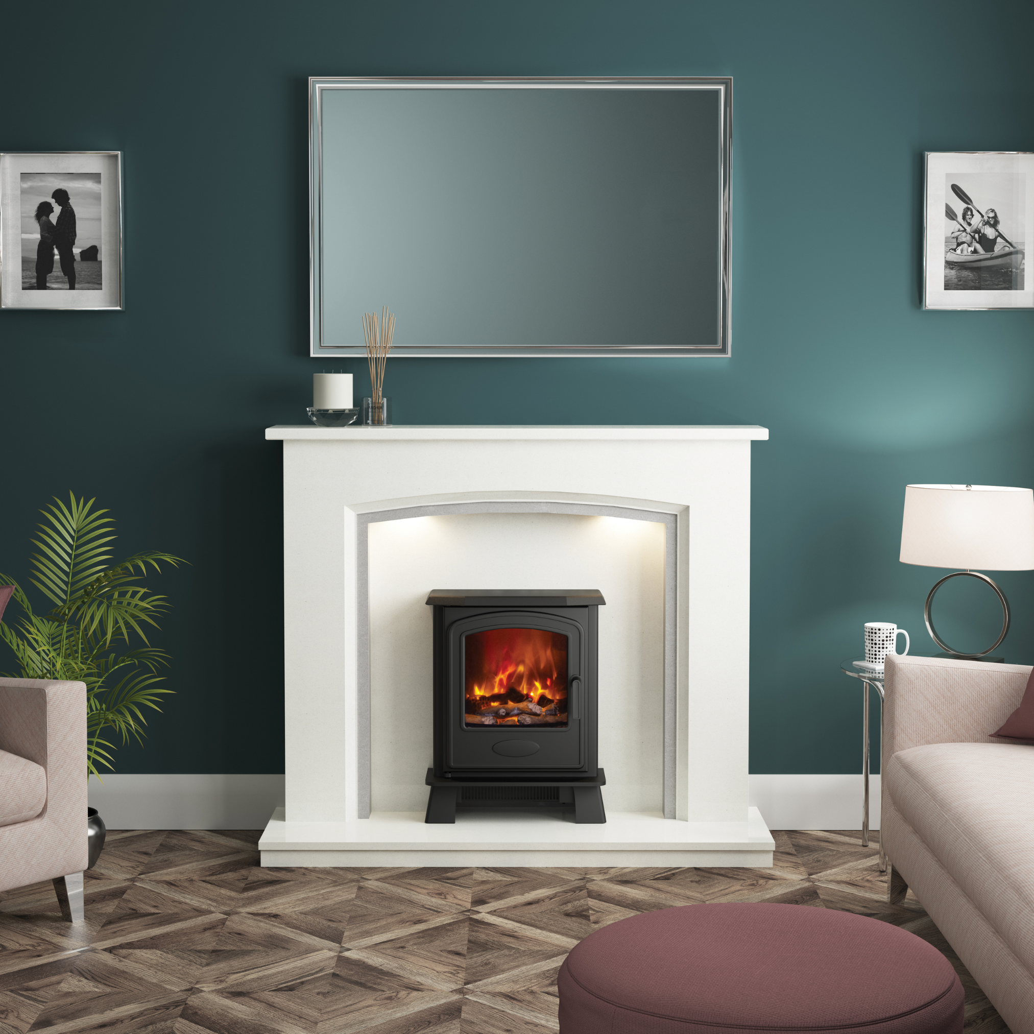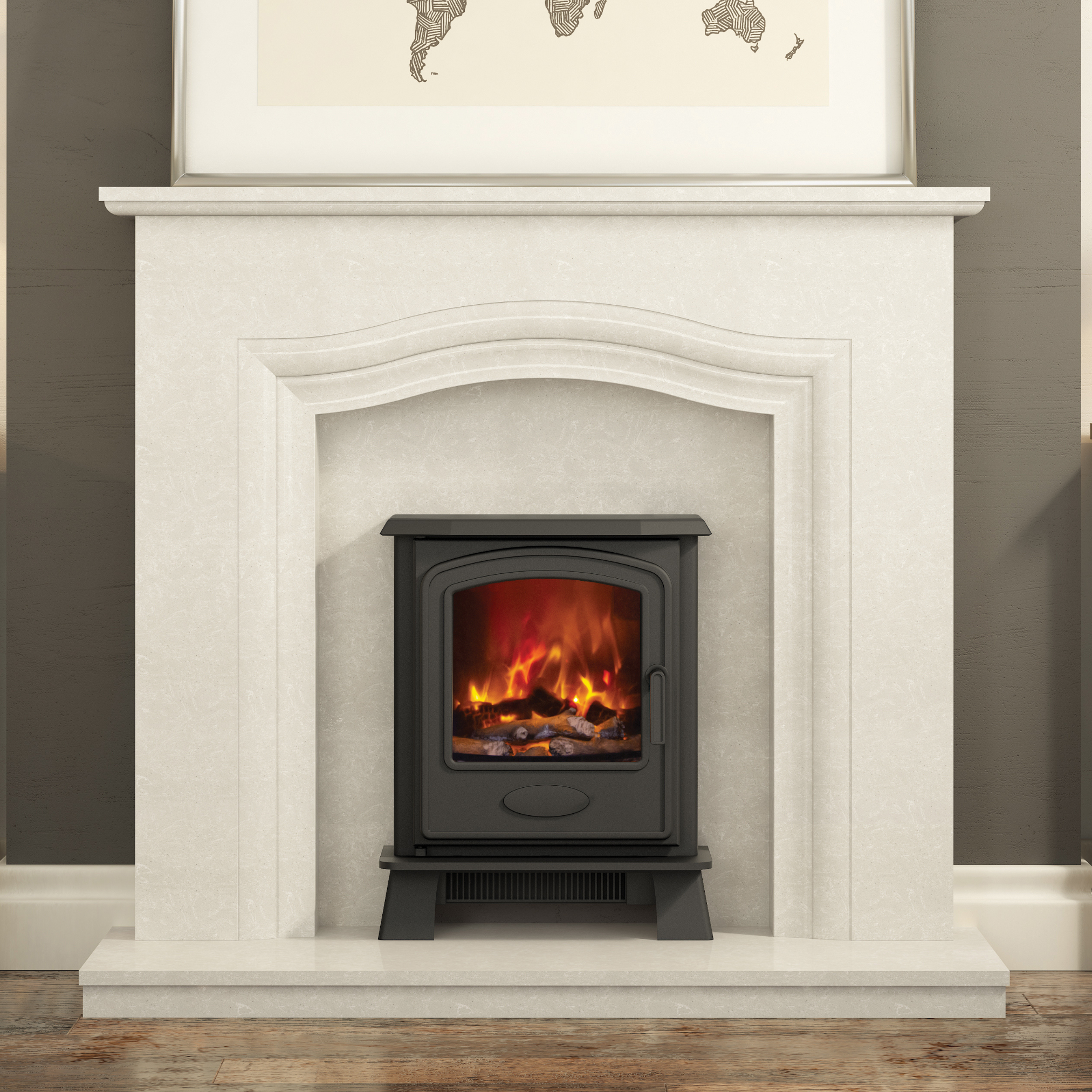 The traditional Ora inset electric stove boasts a gentle arched window set into a Cast Iron door with Steel body. Beautifully finished in Matt Black, the realistic glowing log bed shimmers beneath the dancing flames; enjoy up to 2kW heat or flame effect only, saving energy and money. Boasting a 69mm rebate making it perfect for any 45mm or 75mm rebated marble or timber surround. In the one size, the Ora inset stove will fit into a standard 16” back panel cut out.