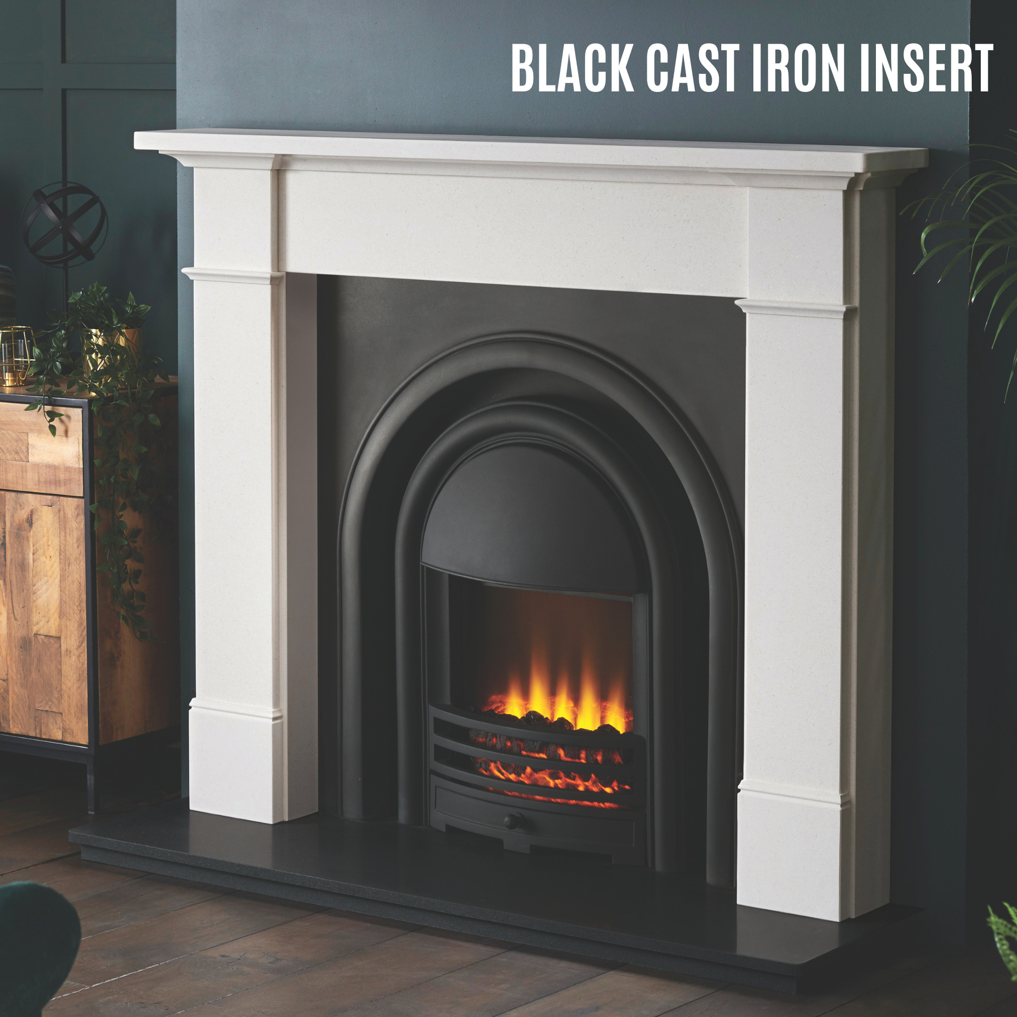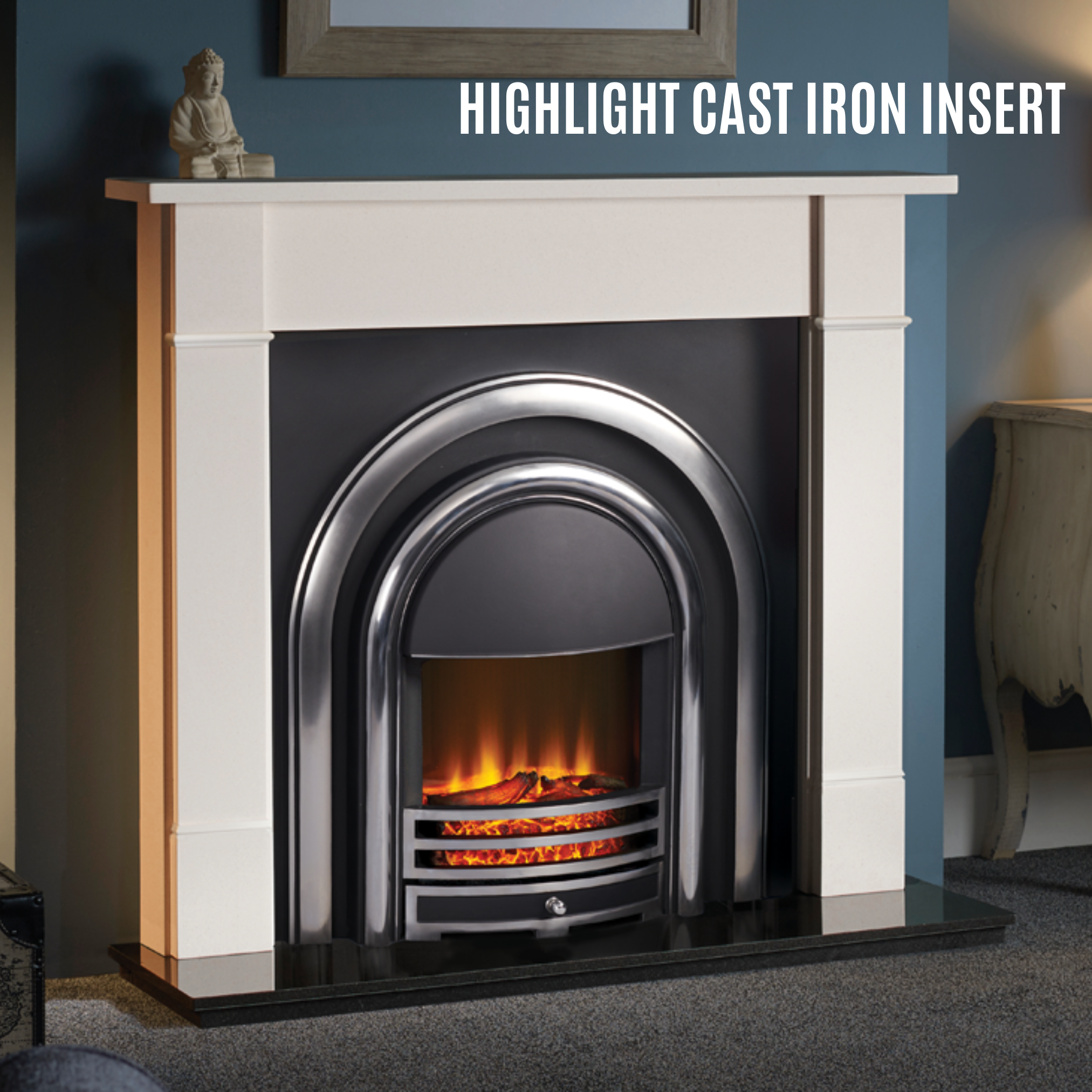 The Provident Electric Suite offers a classic Victorian Aegean Limestone mantel with the ultra realistic SLE 40i etronic electric fire, making it a fine choice for any modern or traditional home. The Flat Wall Provident doesn’t require a chimney or flue, so it can be placed against any flat wall. This electric fireplace is perfect for those who want the look and feel of a real fire without any of the hassle. The Provident insert is available in a Black or Highlighted finish and consists of a back panel and fireframe. By integrating both these components, we are able to create a highly efficient electric fire.