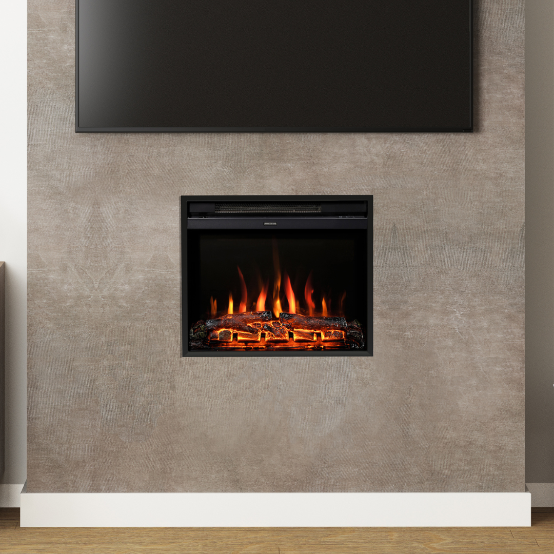 The Rodwell 22” is a contemporary inset electric fire designed to sit perfectly flush within your wall for a clean, high-end finish. Its landscape shape and matt black trim give it a modern, architectural look, while the glowing log bed and five flame dimmer settings let you set the mood from a gentle ember glow to a brighter focal flame.