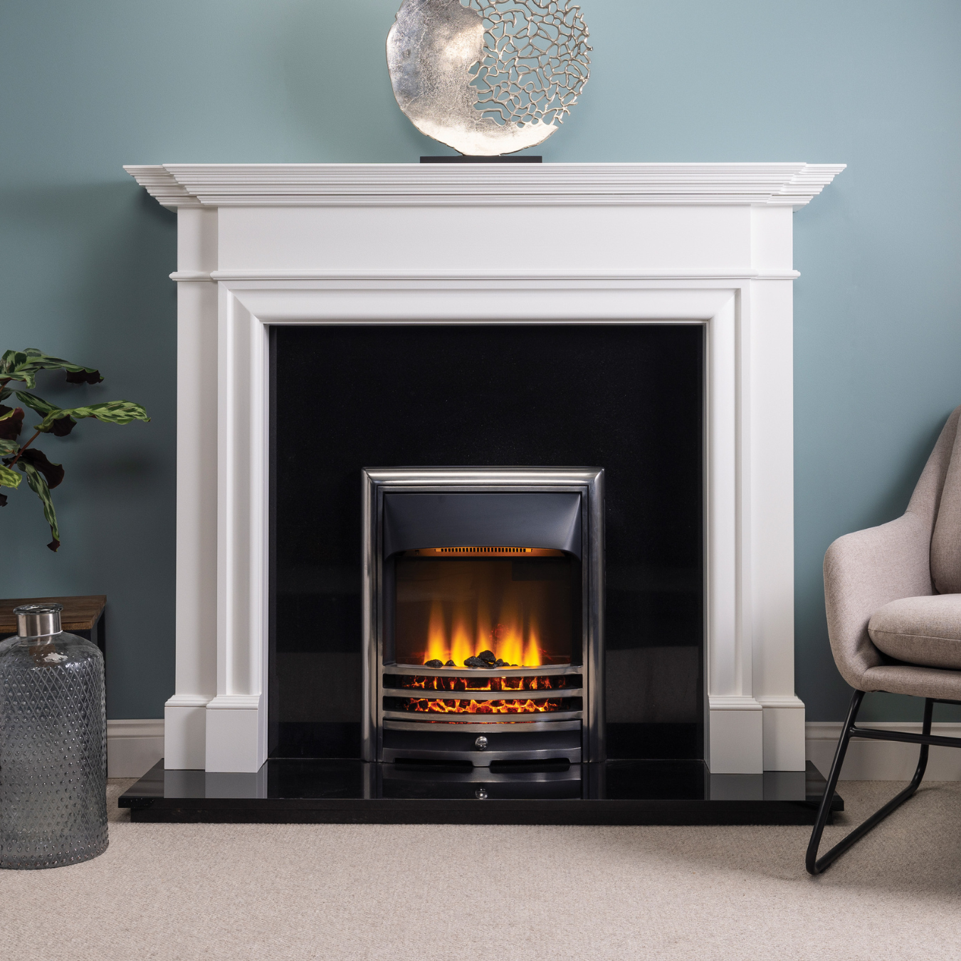 Part of the Prestige collection, the Kingston mantel is grand and decorative. Available in Solid Oak or Painted MDF, the Kingston is pictured here in its standard 57.5″ width finished in White. This mantel can also be made to measure to your exact specifications for a seamless fit in your living space.
