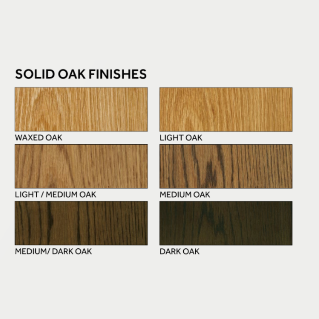 SOLID OAK: Waxed Oak, Light Oak, Light / Medium Oak, Medium Oak, Medium / Dark Oak, Dark Oak