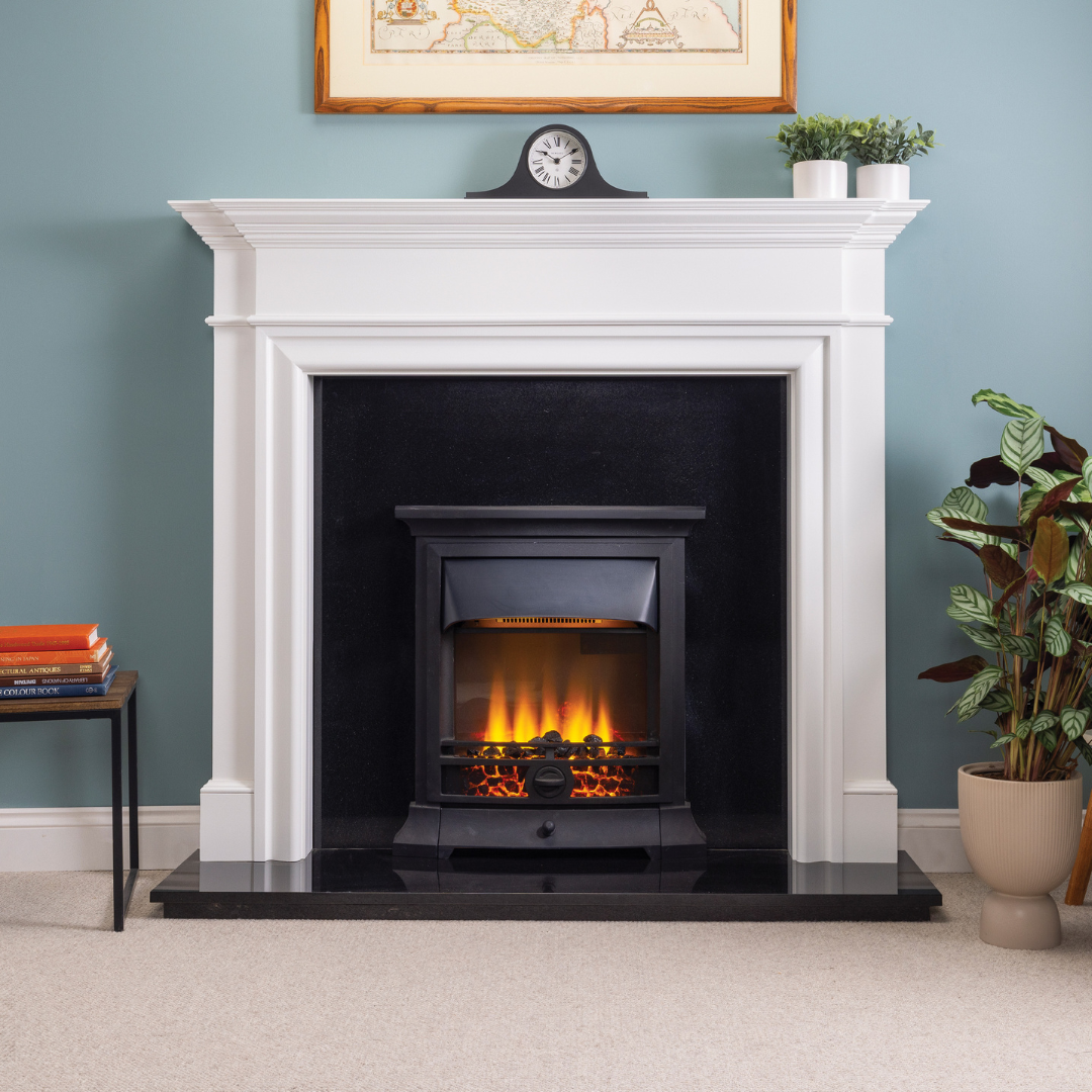 Part of the Prestige collection, the popular Richmond features an emphatic staggered mantel shelf. Available in Painted MDF, the Richmond is pictured here in its standard 57.5″ width finished in White. This mantel can also be made to measure to your exact specifications for a seamless fit in your living space.