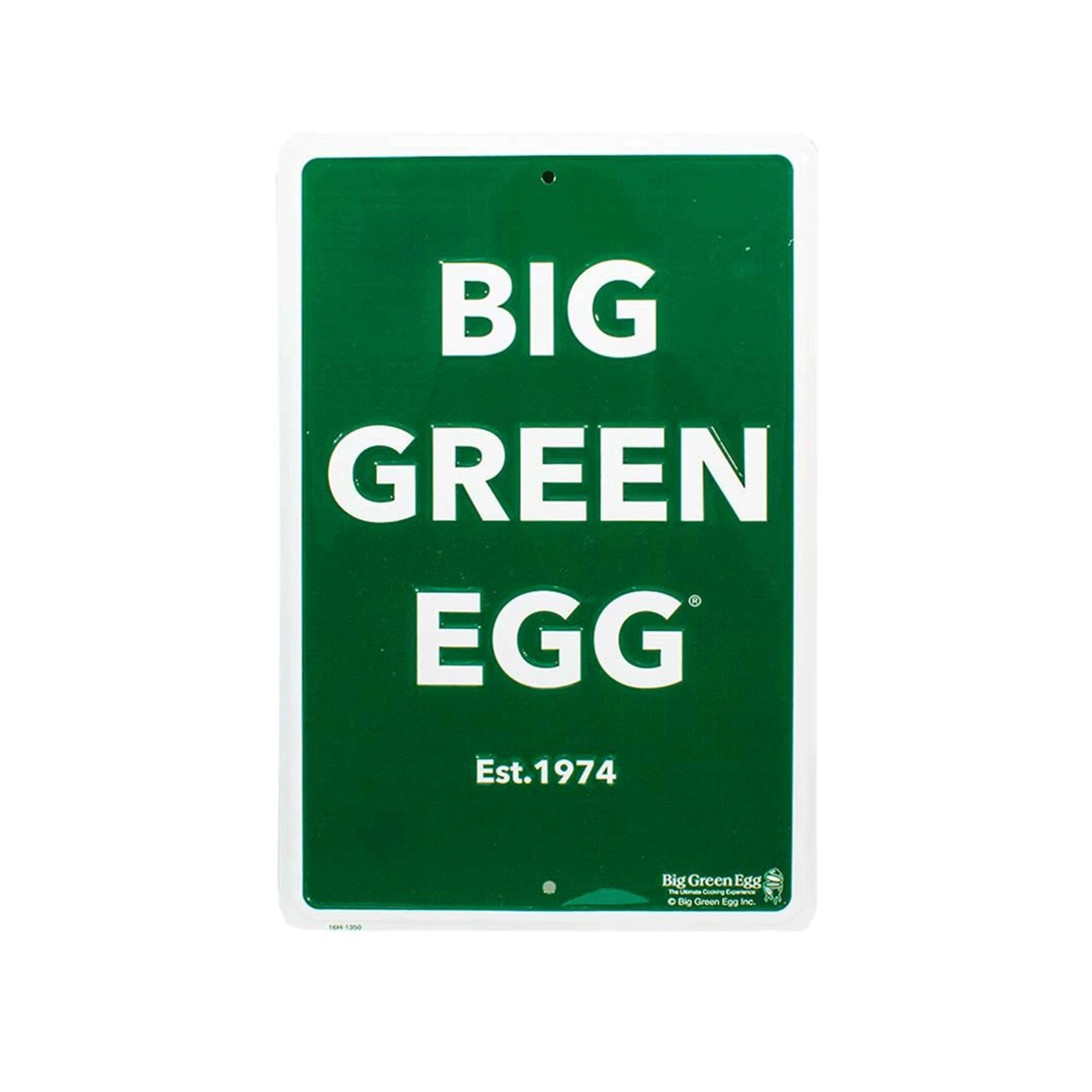 Stamped aluminum with raised print calls out "Big Green Egg" and the year the iconic brand was established.