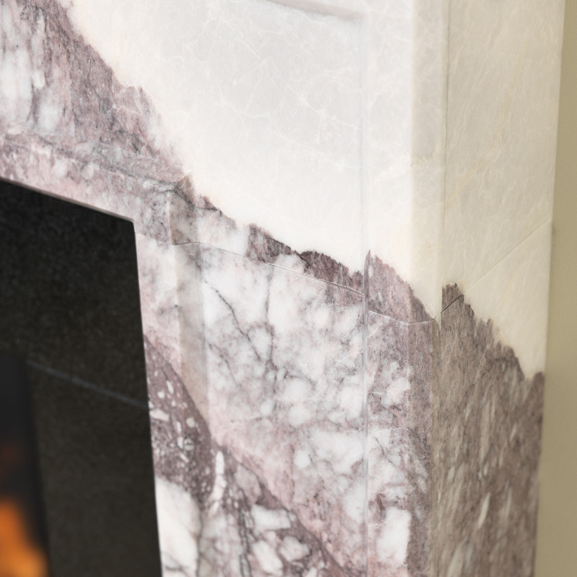 Pictured here in Lilac Marble with the Bassington Eco Compact Skirted stove, porcelain slate chamber and honed granite hearth.