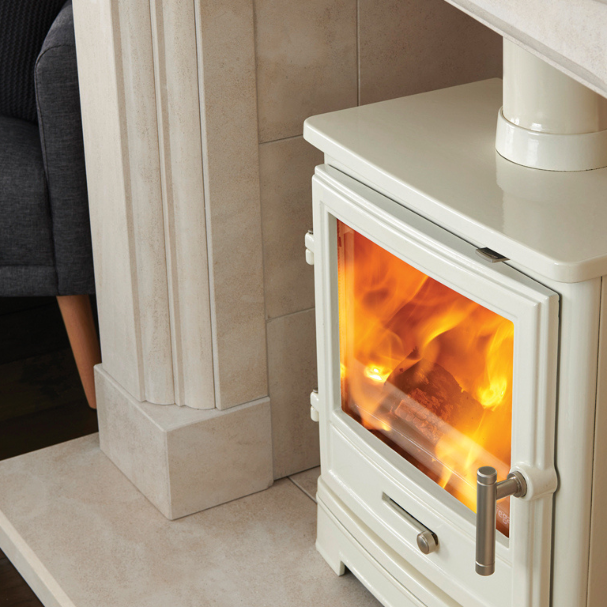 Pictured here in Corinthian Stone with a matching stone chamber and hearth and perfectly paired with the Bassington Eco Baseline multi fuel stove in Warm White Enamel.