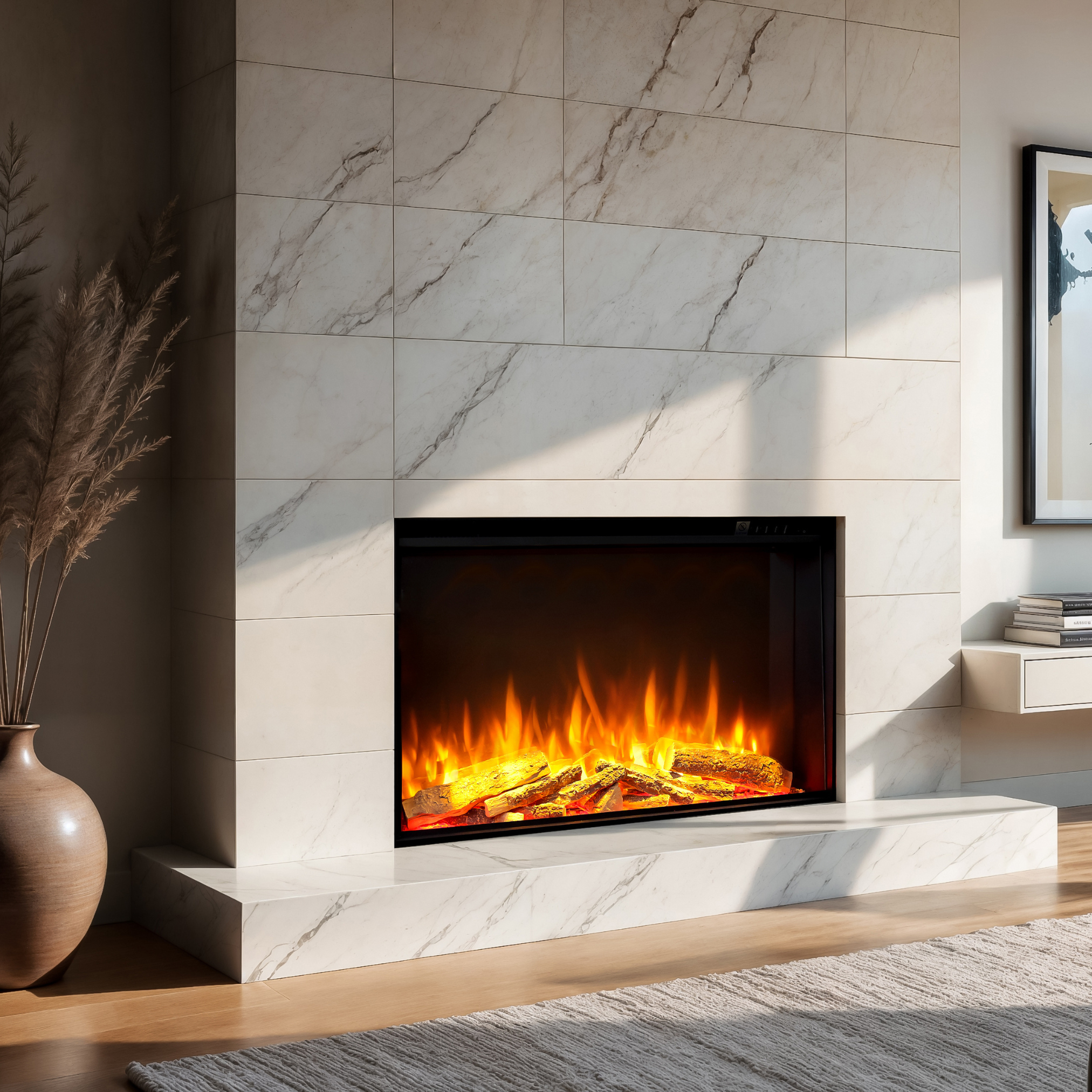 DLX 750 is a fascia-less glass-fronted wall inset electric fire, that creates a minimalist yet striking feature fireplace. This fire comes with Smart connection capability and innovative technology. The fuel effect consists of realistic natural flames, and authentically designed woodland logs placed over a blaze underbed living embers. The flame speed can be easily controlled to suit your desired mood and preference.