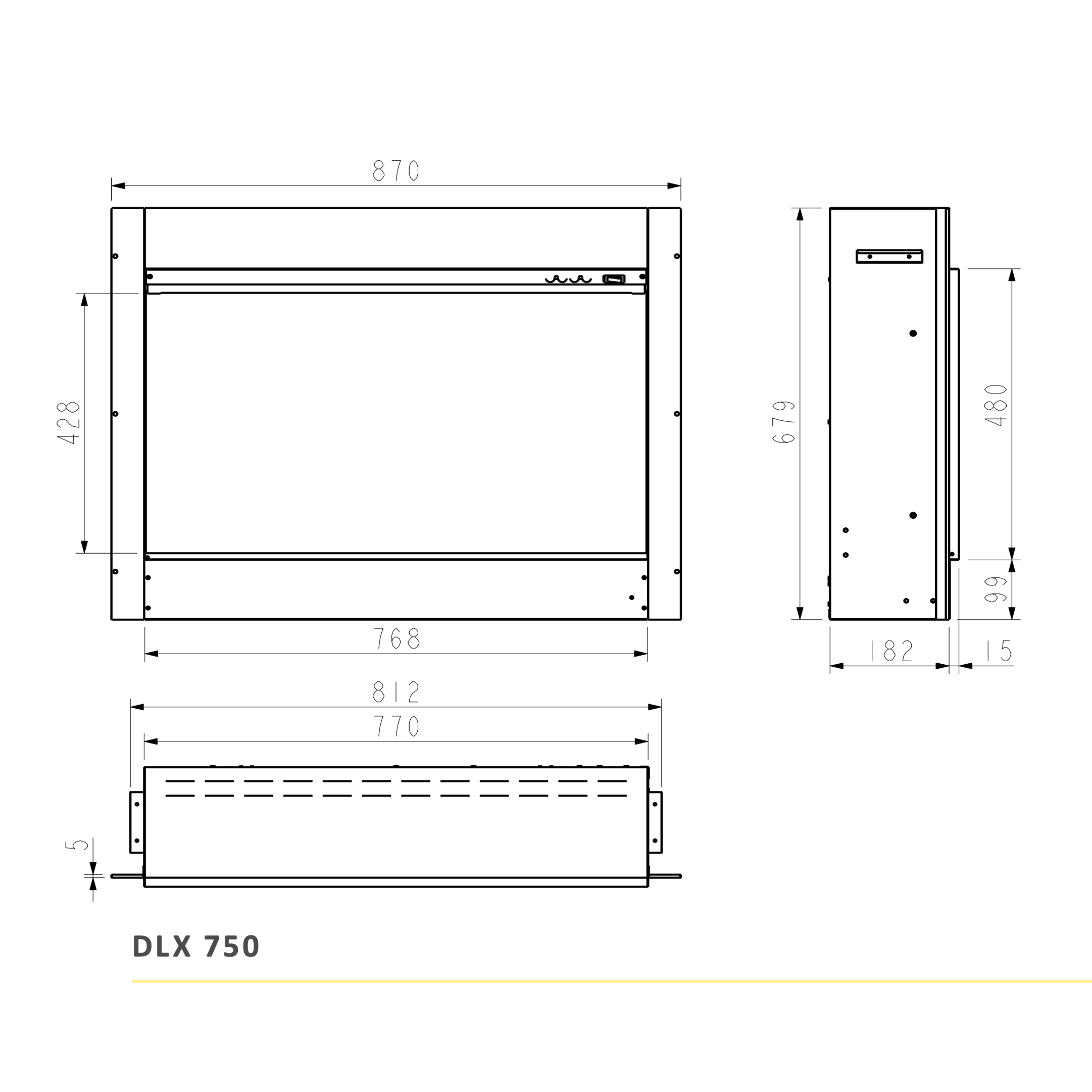 DLX 750 is a fascia-less glass-fronted wall inset electric fire, that creates a minimalist yet striking feature fireplace. This fire comes with Smart connection capability and innovative technology. The fuel effect consists of realistic natural flames, and authentically designed woodland logs placed over a blaze underbed living embers. The flame speed can be easily controlled to suit your desired mood and preference.